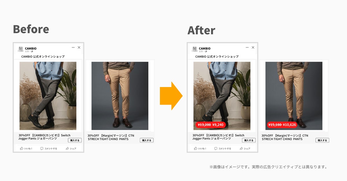 データ結合機能を使うことで、複数のデータに分かれていた「定価」と「セール価格」を簡単に統合し、広告に反映することができるようになりました。Facebookダイナミック広告では、定価の上に取り消し線を引き、セール価格を目立って訴求する表現など、新しい広告表現を試すことが出来るようになりました。