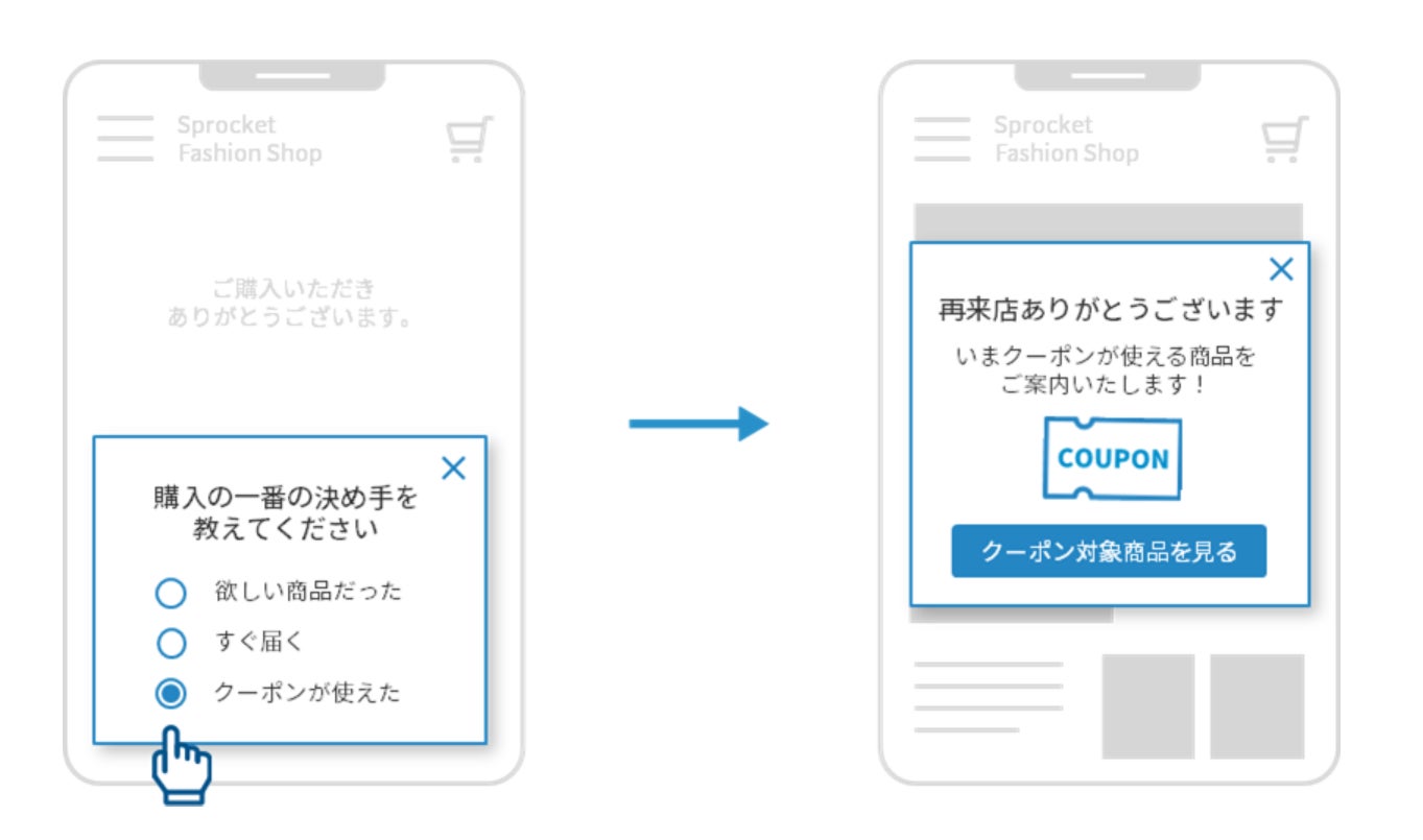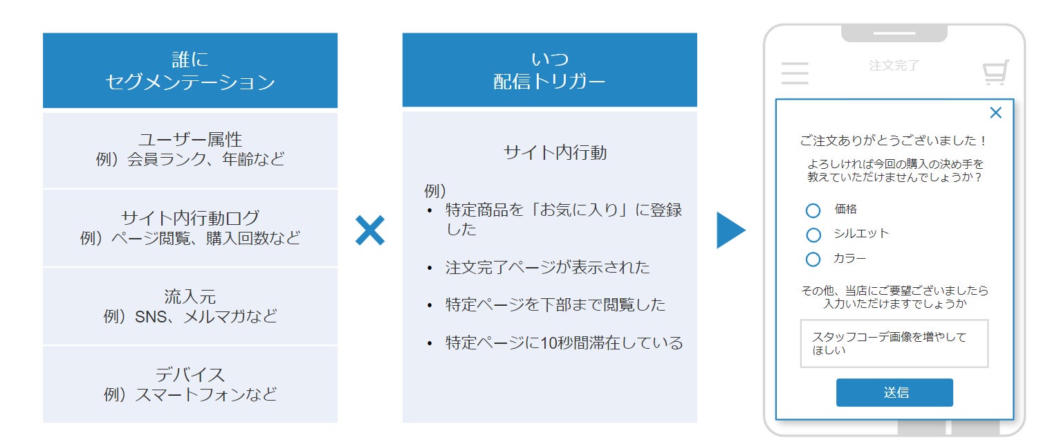<ユーザー属性やサイト内行動をもとに対象ユーザーをセグメントし、最適な場所やタイミングでアンケートを配信>