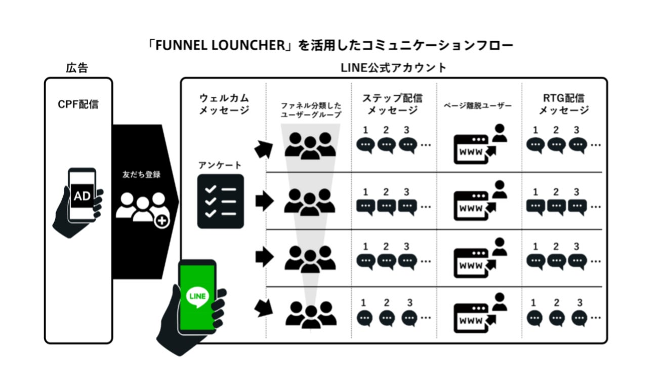 DX推進・マーケティング戦略カンパニーのDOTZ株式会社(本社:東京都渋谷区、代表取締役社長:稲益 仁 以下、「DOTZ」)は、LINE公式アカウントの友だちをファネル分類して、それぞれに適したクリエイティブ配信をおこなうことで、特に検討期間を要する高単価商材の新規顧客獲得を最大化させる「FUNNEL LOUNCHER(ファネルランチャー)」を提供開始します。
