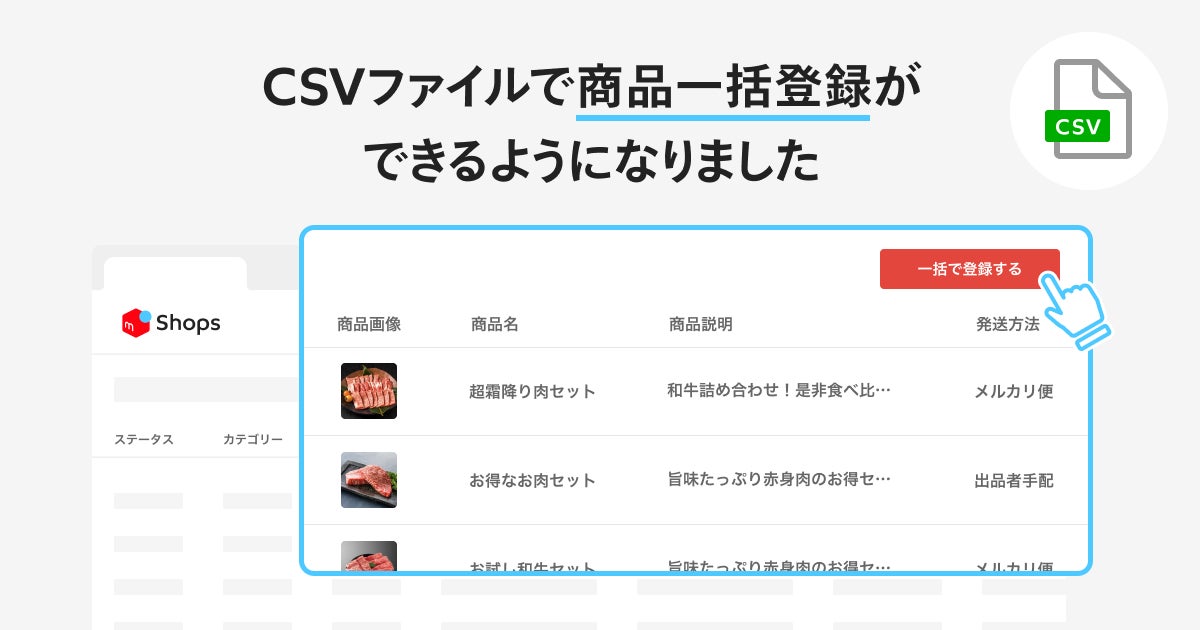 株式会社ソウゾウ(以下、ソウゾウ)が運営する、スマホ1つで誰でも簡単にネットショップを開設できるEコマースプラットフォーム「メルカリShops」は、CSVファイルで商品一括登録が可能になる新機能を公開いたします。
