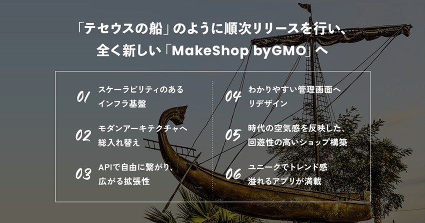 「テセウスの船」(※2)を合言葉に、順次リリースを進めていくことで、2004年より提供を続けてきた「MakeShop byGMO」でありながら、新たな「MakeShop byGMO」へと刷新してまいります。