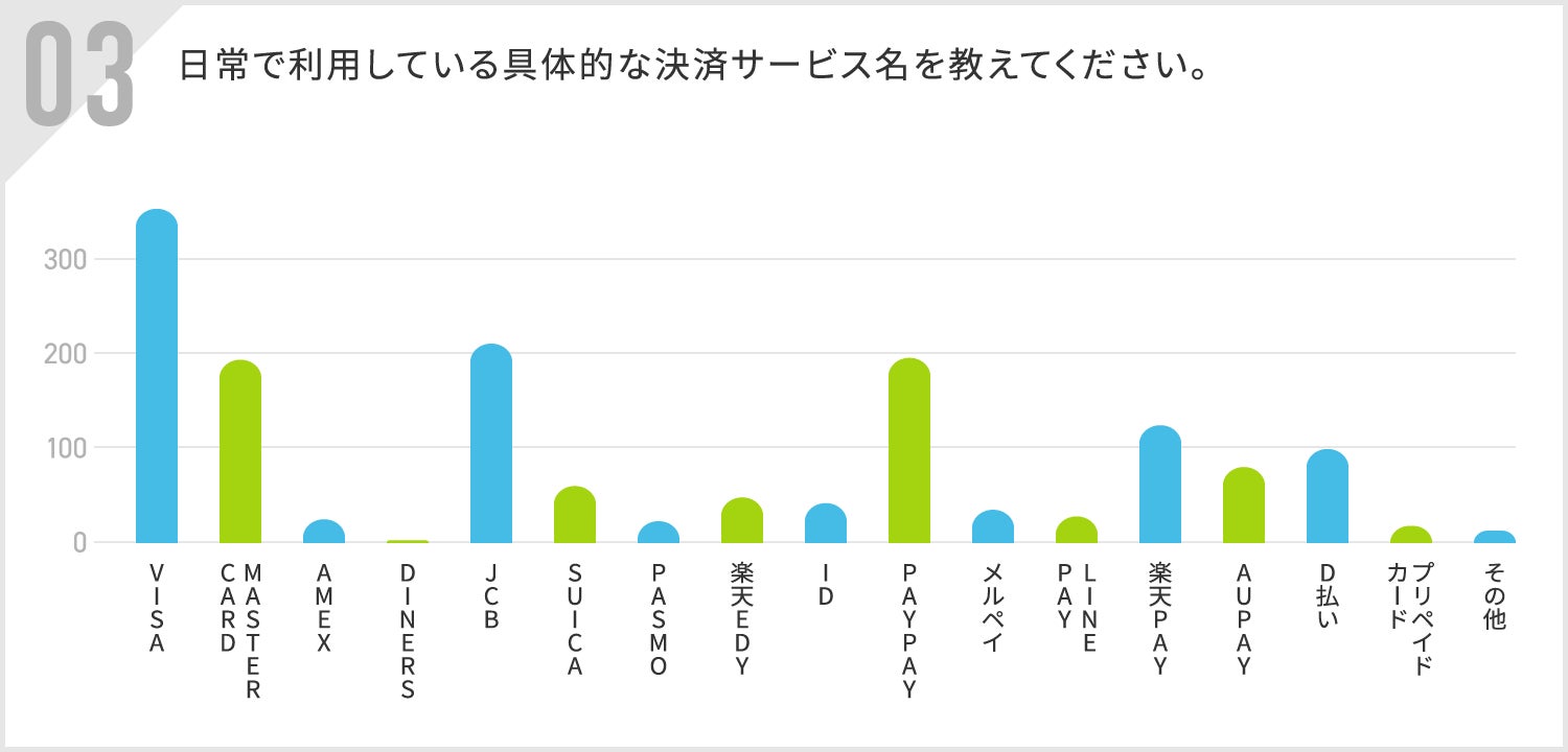 全体ではクレジットカード決済の「VISA」ブランドが最も利用されているという結果となりました。QRコード決済に絞ると、「PayPay」が最も多く、「楽天Pay」、「d払い」がそれに続く結果となりました。