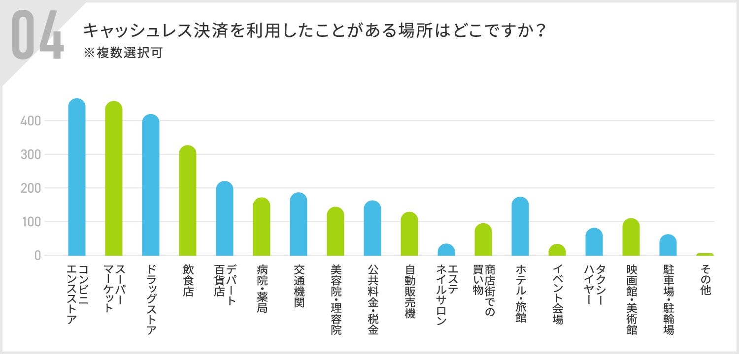 キャッシュレス決済を利用したことがある場所は、コンビニやスーパーマーケットなど、各種キャッシュレス決済に対応している施設が全体の約8割という結果となりました。