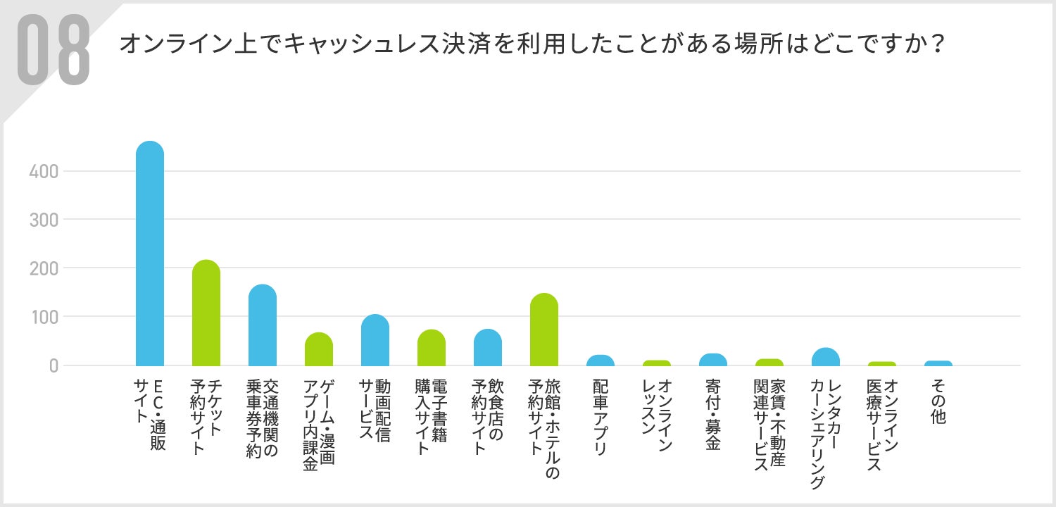 オンライン上でのキャッシュレス決済の利用について、最も多いのはEC・通販サイトでした。その他、チケット予約や旅館・ホテルの予約での事前決済に多く利用されていることが分かります。
