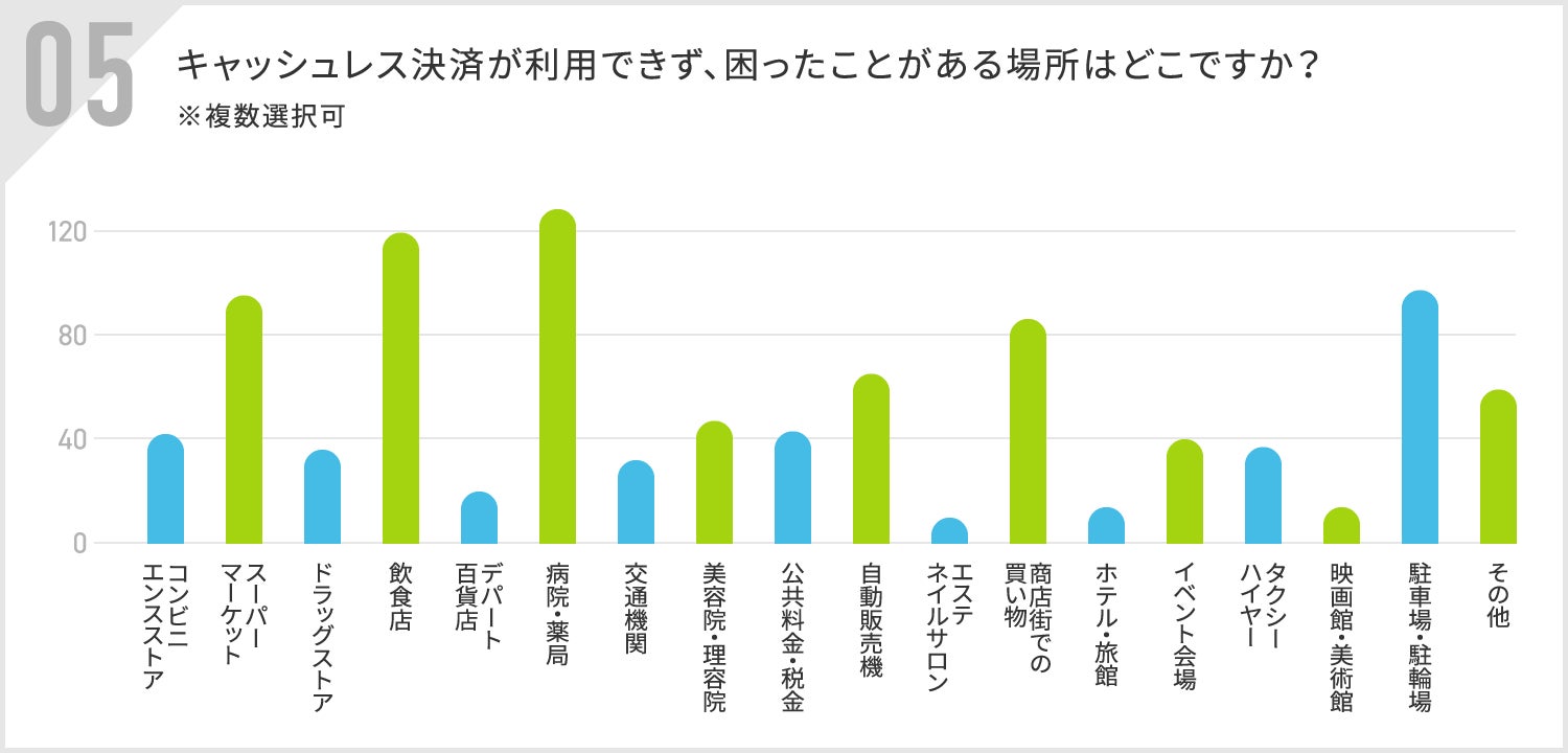 キャッシュレス決済が利用できず困ったことがある場所については病院・薬局最も多く、全体の2割強を占めました。飲食店と駐車場・駐輪場がそれに続く結果となりました。