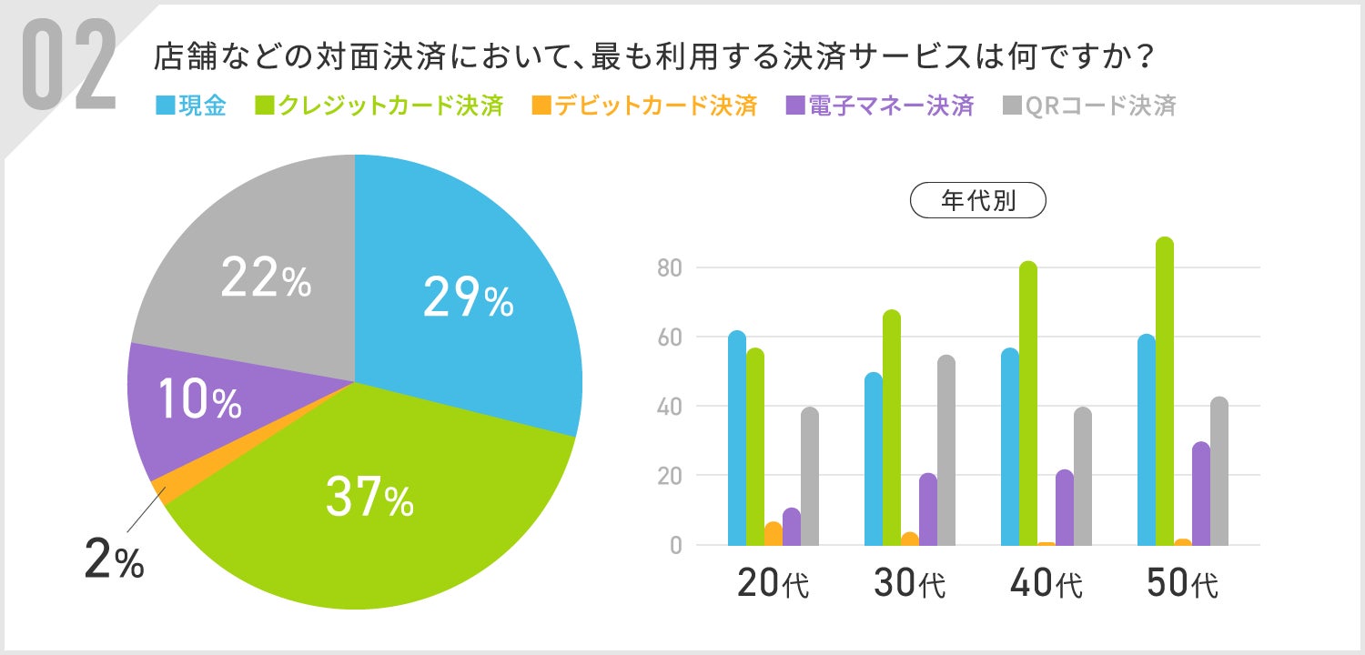 店舗などにおける対面決済において、最も利用する決済サービスは「クレジットカード決済」で全体の37%を占めました。次点は「現金支払い」が29%と、「QRコード決済」や「電子マネー決済」よりも利用率が高い結果となりました。