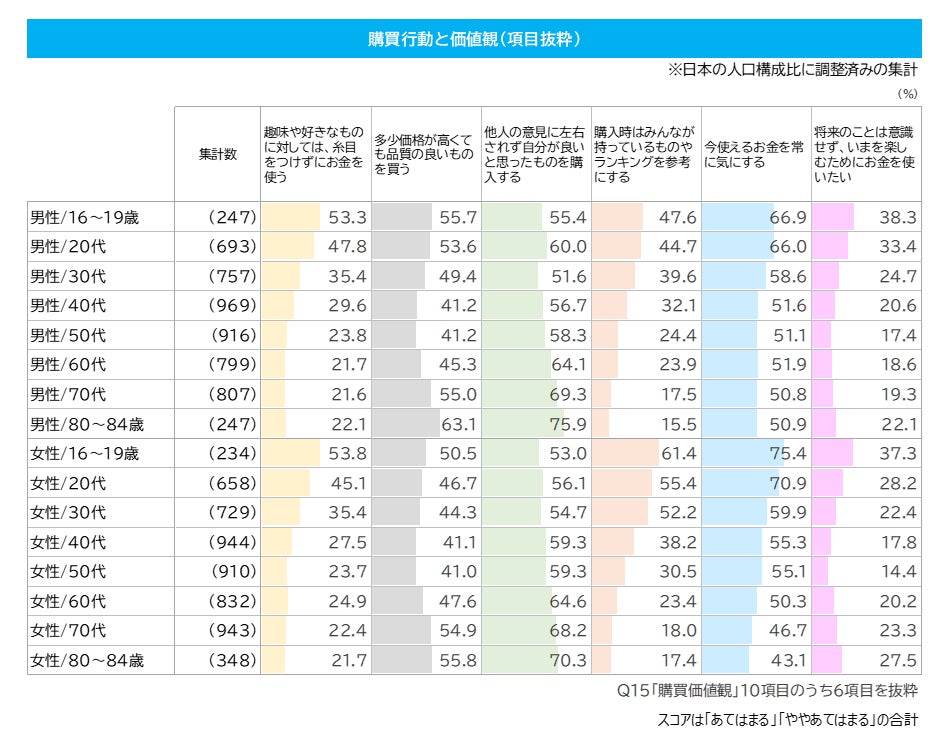 購買行動と価値観については、男女16~19歳・20代の若年層を見ると「趣味や好きなものに対しては、糸目をつけずにお金を使う」「将来のことは意識せず、いまを楽しむためにお金を使いたい」「購入時はみんなが持っているものやランキングを参考にする」が他の年代と比べて高く、娯楽やコミュニケーションのための購買行動・意識が見られました。