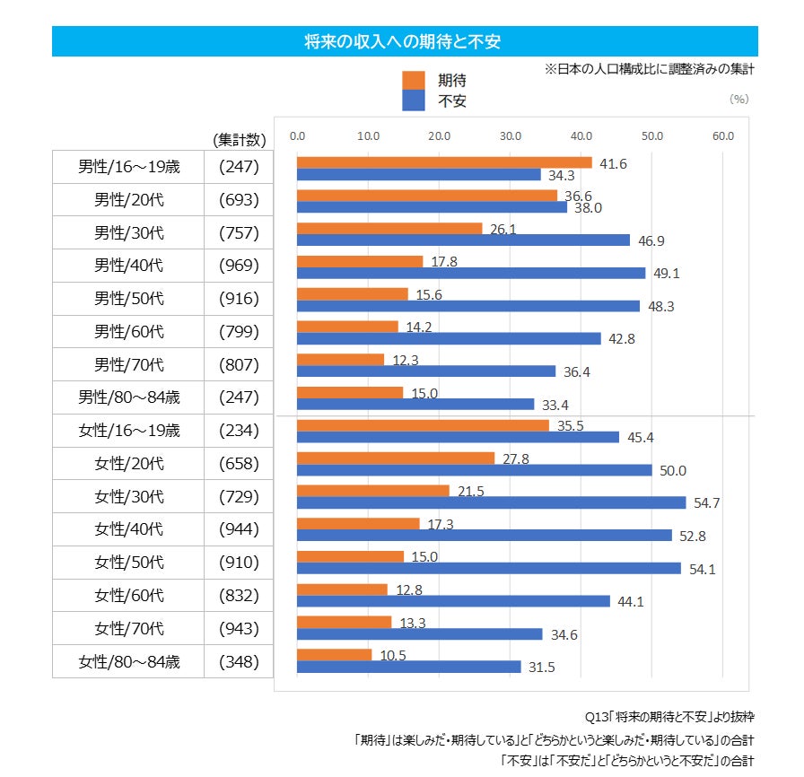 - 収入についてはほとんどの年代で不安が期待を上回る