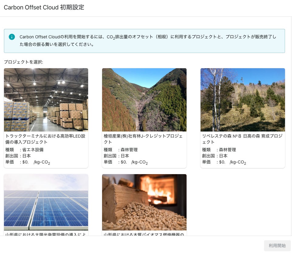 - CO2を削減・吸収するプロジェクトは、環境省などが運営しているJ-クレジット制度が認証した、日本全国の様々なCO2排出削減・吸収プロジェクトのクレジットを取り揃えています。ラインナップは順次拡大する予定です。