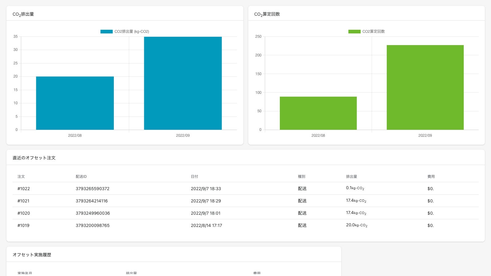 - ダッシュボードで、CO2排出量やカーボン・オフセットの実施履歴を確認することができます。