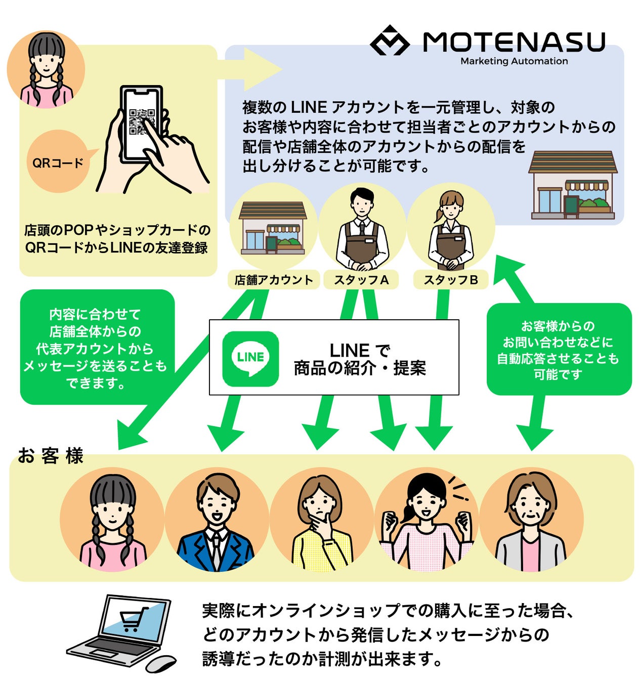 もっとも基本的な運用としては、店頭のPOPやショップカードなどに記載したQRコードから、LINEのお友達登録を促し、お友達登録していただいた方々に対して商品訴求やECへの誘導をLINE配信していくといった施策が、CRMツール「MOTENASU」の活用で可能になります。