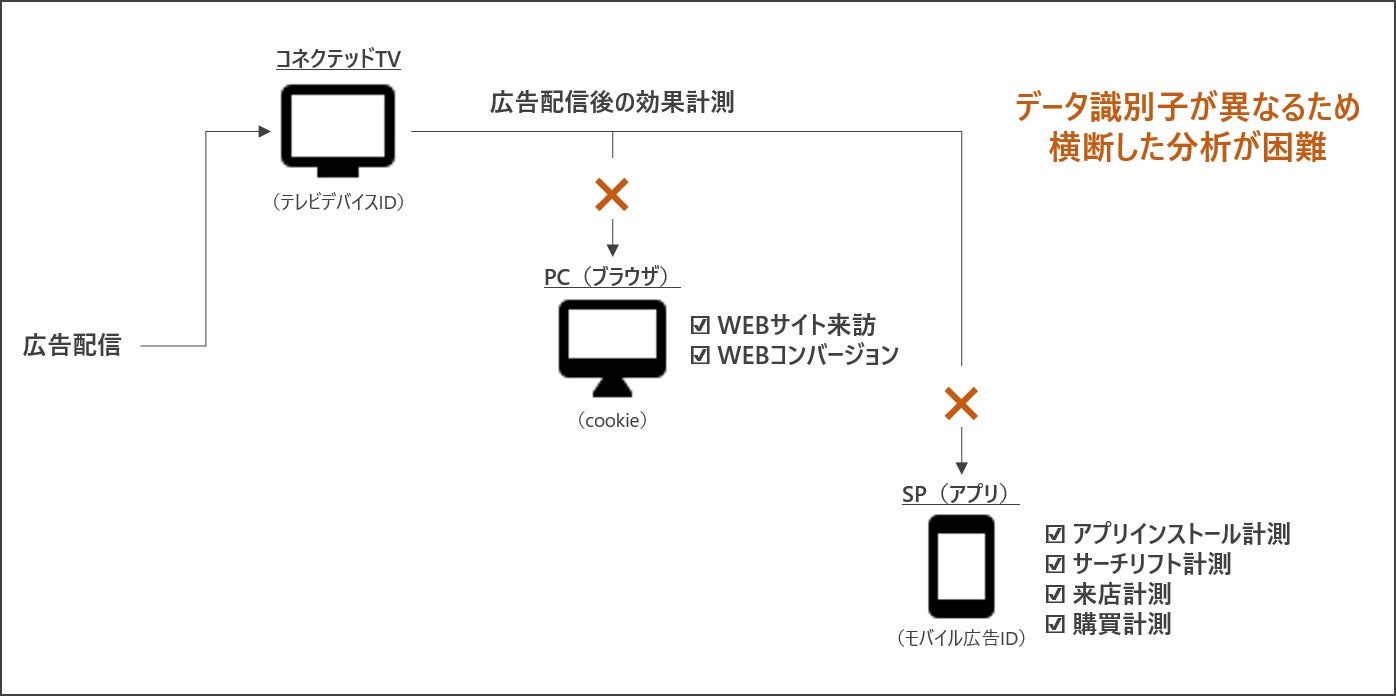 これまで、コネクテッドテレビデバイスでの広告展開においては、従来のウェブブラウザ、スマートフォンアプリとは異なるデータ識別子であるが故に、従来デジタルマーケティングにおいて行うことが出来た様々な分析が困難であるという課題がありました。