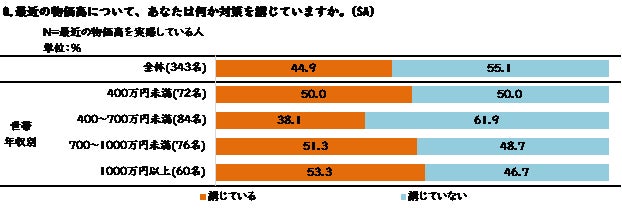 現在の物価高を実感している人の44.9%が対策を「講じている」と回答しました。これは上記の「悪い影響があった」の割合に比べて低く、特に世帯年収が低い層で差が大きい傾向がみられました。世帯年収が低い層は物価高による悪影響を受けやすい上に、対策を講じるのも難しい状況であることがわかりました。
