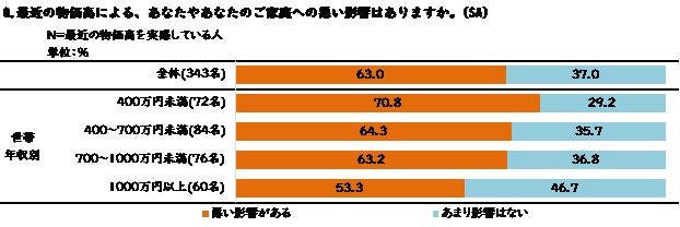現在の物価高を実感している人の63.0%が「悪い影響がある」と回答しました。これを世帯年収別でみると、400万円未満の層では70.8%、400~700万円未満の層では64.3%、700~1000万円未満の層では63.2%、1000万円以上の層では53.3%となっており、年収が低い層ほど割合が高くなっています。悪い影響の具体的な内容は主に経済的な影響(欲しいモノが買えない、家計圧迫)と身体への影響(精神的ダメージ、健康を損なう)に分かれました。