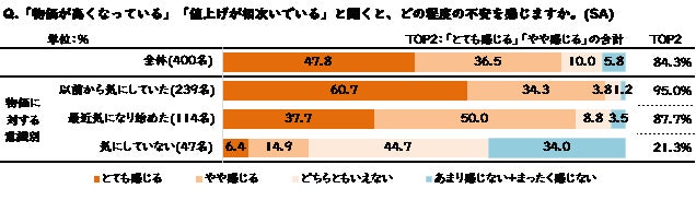 物価高と聞いて不安を「とても感じる」割合は全体では47.8%、「やや感じる」を合わせると84.3%と8割以上となりました。これを物価高に対する意識別でみると、■以前から物価を気にしている層は60.7%、■最近になって気になり始めた層は37.7%、■以前も今も気にしていない層は6.4%、と顕著な差が表れました。