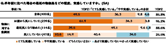 もともとの物価意識が強い層ほど物価高に強い不安を感じ、現在の物価高を強く実感している