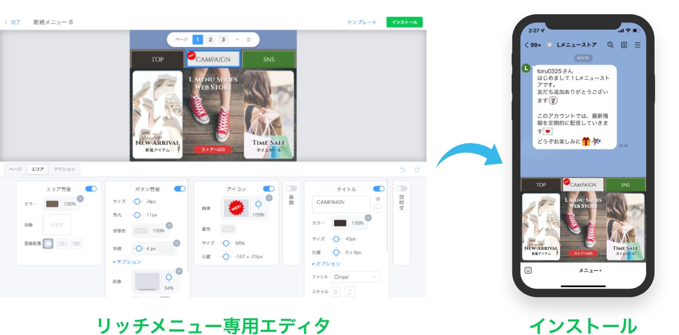 リッチメニューデザインのためだけに開発された専用エディタは、直感的で誰でも使いこなすことができます。あらかじめLINE公式アカウントを登録しておけば、デザインを変更した後に数秒で公式アカウントにインストールできるので、従来のように画像別途作成しアップロードする必要はありません。
