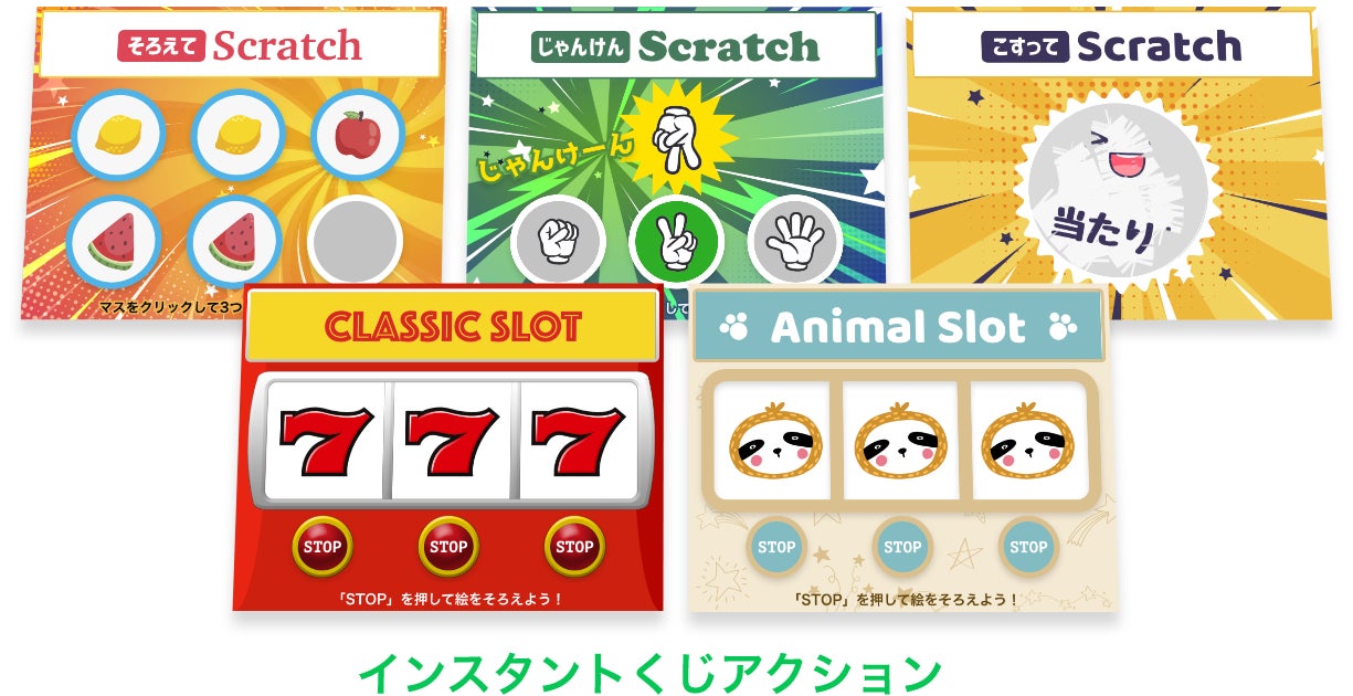 LINE公式アカウントへのリピート率を上げたいと思っている運営者さまのために、スクラッチやじゃんけんゲーム、スロットマシンなど、エンターテイメント性に富んだ「インスタントくじ」を設置できる特別なアクションを用意。