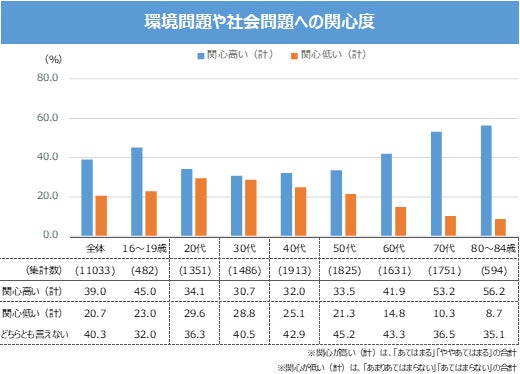 最初に、世代別に環境問題や社会問題への関心度を見ていきましょう【図1】。年代別では、年令層が高い60代以上と10代が全体と比較して関心度が高くなっています。続いて、関心度の低い層もみていきます。全体と比較し、関心度が低いと回答している割合が2割を超えるのは10代から50代となり特に20代と30代は、関心度の高い層と低い層が、近しい割合で存在している事がわかります。このことから、20代、30代は同世代間で環境問題や社会問題について、関心度の二極化現象が起きているといえそうです。
