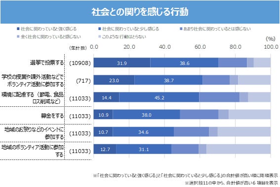 次に、学生等に限定して質問した「学校でのボランティア活動に参加する」が61.7%と続きます。今回の調査回答者の全てが社会との関りを感じる行動として回答しているのが「環境に配慮する」行動です。続いて「環境に配慮する」が続きます。59.6%が環境に配慮することで、社会との関りを実感すると回答しています。これは、日本の社会インフラの中でごみの収集・分別や、限られた資源を有効に活用する廃品回収といった地域社会との関係を基盤にした仕組みが整っている事も社会との関りを実感している要因といえそうです。
