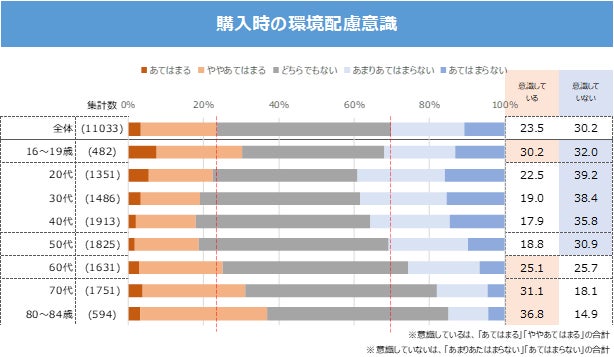 次に、【図3】では、購入時に購入する商品やサービスがサステナブルであること、環境に配慮されていることを購入時に意識しているかを尋ねています。全体では、23.5%が意識していると回答しています。反対に、意識していない層は30.2%にのぼり、生活者の購入時における環境配慮への意識浸透は拡大の余地がある状況であることがわかります。世代別では、全体と比較して20代~50代は意識していない層が多く、60代以上は意識している層が多くなります。これは、【図1】環境問題や社会問題への関心度と近しい動きになっており、60代以上のシニア世代は、関心もあり、購入時の行動も連動していると言えそうです。