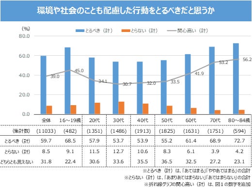 続いて、自身の行動に対して環境や社会への配慮が必要だと考えているかどうかを尋ねました【図2】。すると、すべての世代で「行動をとるべき」であるという回答が、関心度の高さ(【図1】「関心高い(計)」の集計数を折れ線グラフで追加)を上回る結果となりました。これは、多くの生活者が自身に課せられた義務を果たすこと未来に向けて環境や社会をよいものに維持する事に対しては一定の理解を表わしていると言えそうです。