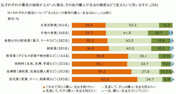 価格上昇に伴って、見直して購入・支出を控えたいとの意向が強い費目としては、「水道光熱費」「外食の食費」「食事以外の飲食費(菓子、ケーキなど)」「被服費」が上位に挙がりました。逆に、これまでと同じく購入・支出を続けたい費目としては、「住宅費」「医療費」「教育費」「保険料」が上位に挙がりました。金額の大きい費目や定期性のある費目よりも、身近で手軽な費目の見直しが優先されています。いきなり抜本的に変更するのではなく、手っ取り早く可能なところから購入・支出を見直そうとする意向が表れています。