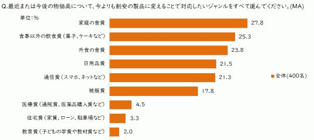 最近または今後の物価高について割安品への変更で対応したい費目としては、「家庭の食費」「食事以外の食費(菓子、ケーキなど)」「外食の食費」が上位に挙がりました。物価高の環境では、食費に対する節約意識が強く、消費行動にも変化が起こりやすいことがわかります。具体的には「割引品や見切り品を探す」「まとめ買い」「価格や製品の見比べ」などの変化を推測できます。他にダウングレードが生じやすい費目としては、「日用品費」「通信費」があてはまります。食品、日用品、通信は物価高がブランドスイッチの契機となる可能性が相対的に高いということがわかります。