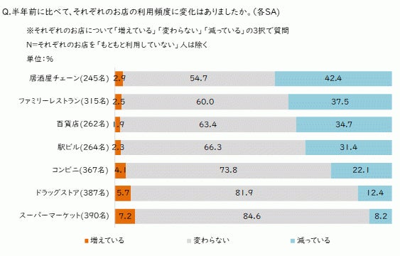 半年前に比べて利用頻度が「減っている」との回答が多かったのは、「居酒屋チェーン」「ファミリーレストラン」の飲食系の店舗でした。非飲食系では「百貨店」「駅ビル」に加えて「コンビニ」も高い割合となりました。「コンビニ」に比べると「スーパーマーケット」の割合は低く、「スーパーマーケット」については利用頻度が「変わらない」との回答が各業態のなかで最も多くなりました。スーパーマーケットは、物価高の環境でも比較的安定感のある業態です。非飲食系であっても、他の業態のように割引の印象が薄く、便利さを特徴とするコンビニには、物価高が不利に働くことがわかります。