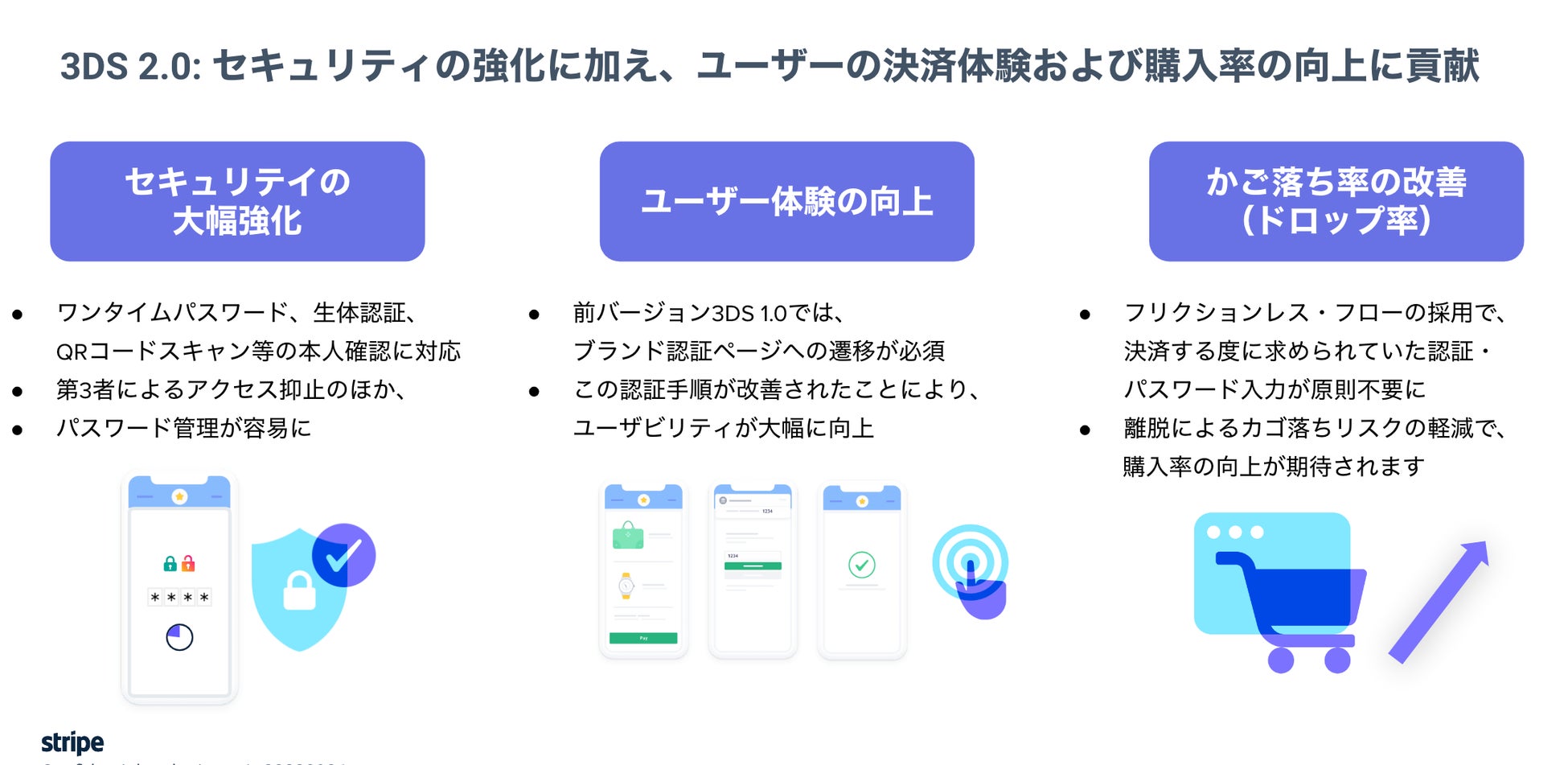 3D セキュアは、クレジットカードの不正利用を防止するための本人認証規格です。3D セキュア 2.0 (EMV-3D セキュア あるいは 3DS2) は、一度だけ使えるワンタイムパスワードによる認証により、第三者によるアクセスの抑止や、パスワードの管理が容易となります。ブランド認証ページに遷移する動きが必要となっていた前バージョンの 3D セキュア 1.0 (3DS1) と比べ、セキュリティの強化だけでなく、認証手順の改善によるユーザビリティの向上とドロップ率(かご落ち率)の解消が期待されます。なお、既にStripe で 3D セキュア 1.0 をお使いの方は、追加の対応を行う必要なく自動的に 3D セキュア 2 .0 へと移行されます。また、昨今増加傾向にある不正使用および不審請求を機械学習で防ぐ Stripe Radar と組み合わせることで、より盤石なセキュリティ対策を行うこともできます。