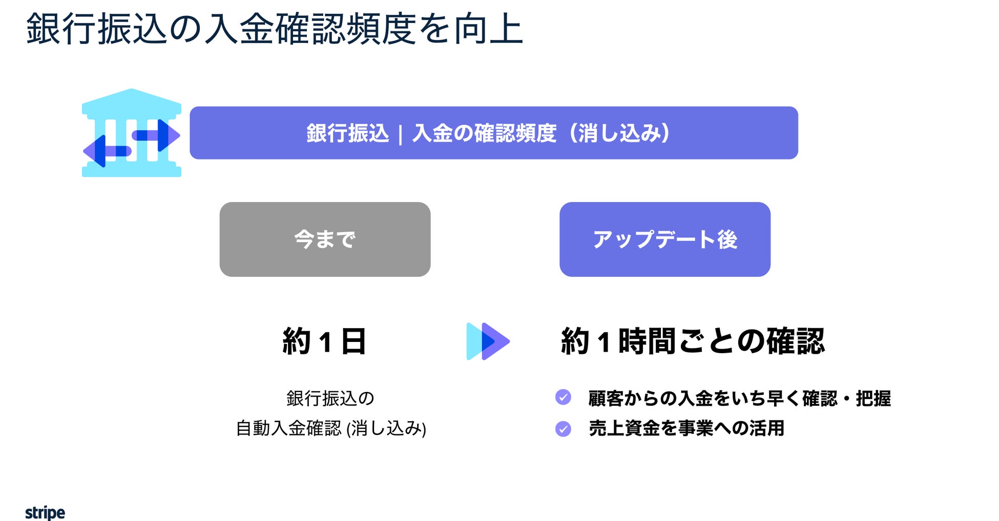 今まで約 1 日かかっていた銀行振込の自動入金確認 (消し込み) を、 1 時間毎に実施できるよう頻度を向上しました。これにより、お客様からの入金を一日待たずとも確認ができ、より細かく、より早く把握することができるようになります。