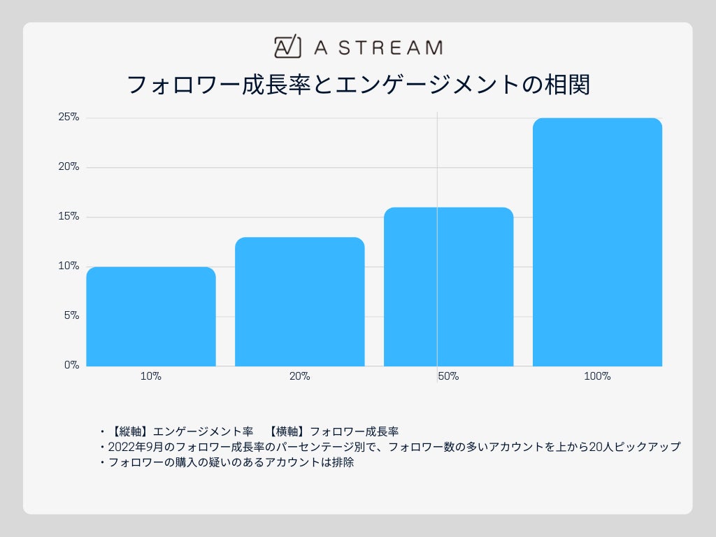 上図はインフルエンサーマーケティングツール『Astream』を用いた独自調査になります。エンゲージメント(いいねやコメントが起こる確率)が高いインフルエンサーは、SNSプラットフォームから「高評価」を受けている可能性が高く、ユーザーへの「露出」が多くなり、フォロワー成長率も高くなる傾向にあります。