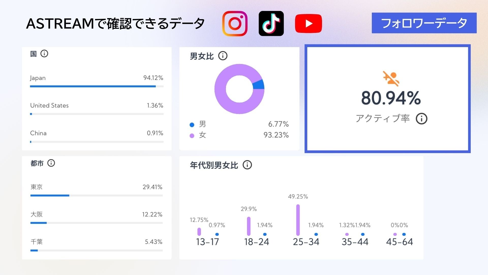 上図はAstreamで確認できるデータの一例。右上の『アクティブ率』は、フォロワーのログイン頻度や実在率などを示しています。フォロワーを購入しているアカウントは、このアクティブ率が低い傾向にあり、伴ってエンゲージメント率も低い傾向にあります。