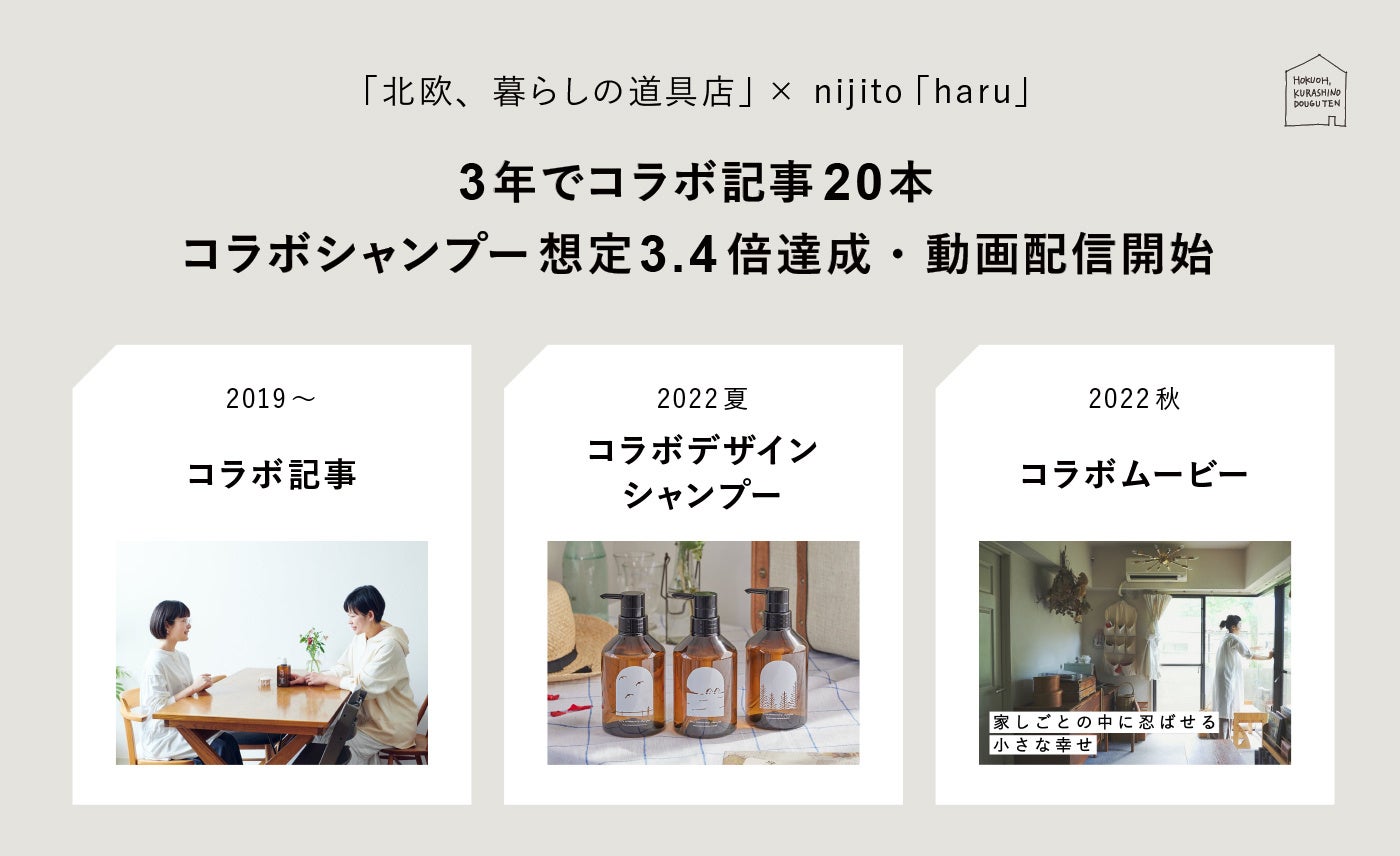 株式会社クラシコム(本社:東京都国立市、代表取締役社長:青木耕平、以下「当社」)が運営するライフカルチャープラットフォーム「北欧、暮らしの道具店」の企業向けマーケティング支援プログラム「BRAND SOLUTION(ブランドソリューション)」において、株式会社nijito(以下「nijito」)のブランド「haru」(ハル)が販売するシャンプー「haru kurokami スカルプ」 のコラボレーションを実施。商品の認知拡大を目指して2019年9月から3年をかけて18本のコラボ記事を作成し、「haru」の商品ページへの最高誘導率(CTR)21.2%を達成、コラボデザインで「北欧、暮らしの道具店」にて販売したシャンプーが売上想定の3.4倍を達成した実績を発表いたします。