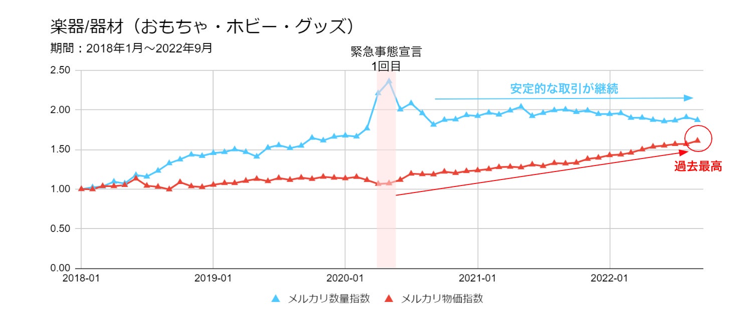 新型コロナウイルス感染症の拡大に伴って増加した「おうち時間」。「メルカリ」では「楽器・器材」の取引が活発化し、数量指数も1回目(2020年3月)の緊急事態宣言中に急上昇していました。その後、数量指数は大きな下落をすることなく、「メルカリ」上でも安定的な取引が継続していることが示唆されます。一方、物価指数は急上昇を見せることなく徐々に上昇を継続しており、現時点では過去最高の物価指数となっています。