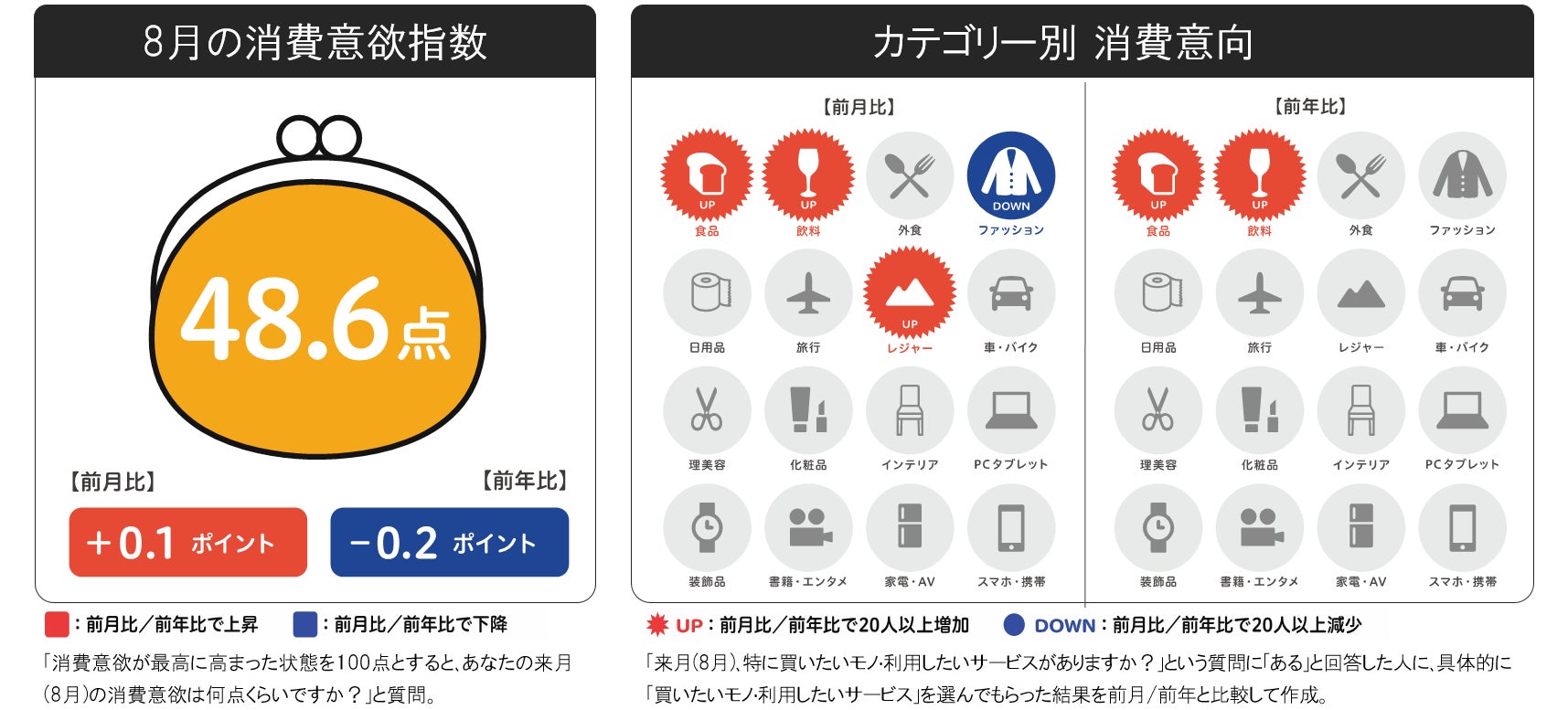 カテゴリー別の消費意向をみると、前月比では「書籍・エンタメ」「食品」「飲料」が20件以上減少しています。また、前年比では、「旅行」が20件以上増加し、「書籍・エンタメ」「インテリア用品」「パソコン・タブレット・周辺機器」が20件以上減少しています。