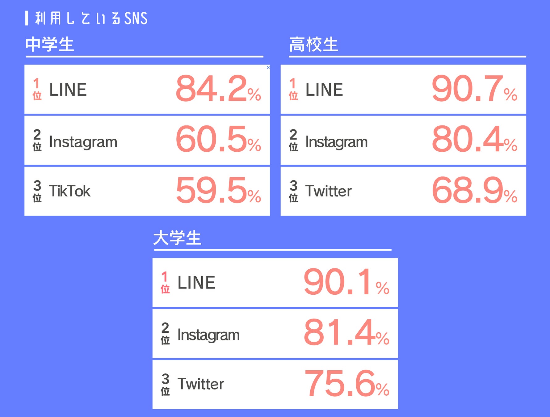- 調査記事概要:中高大学生別、SNS利用率トップは「LINE」、「Instagram」も全年代でランクイン