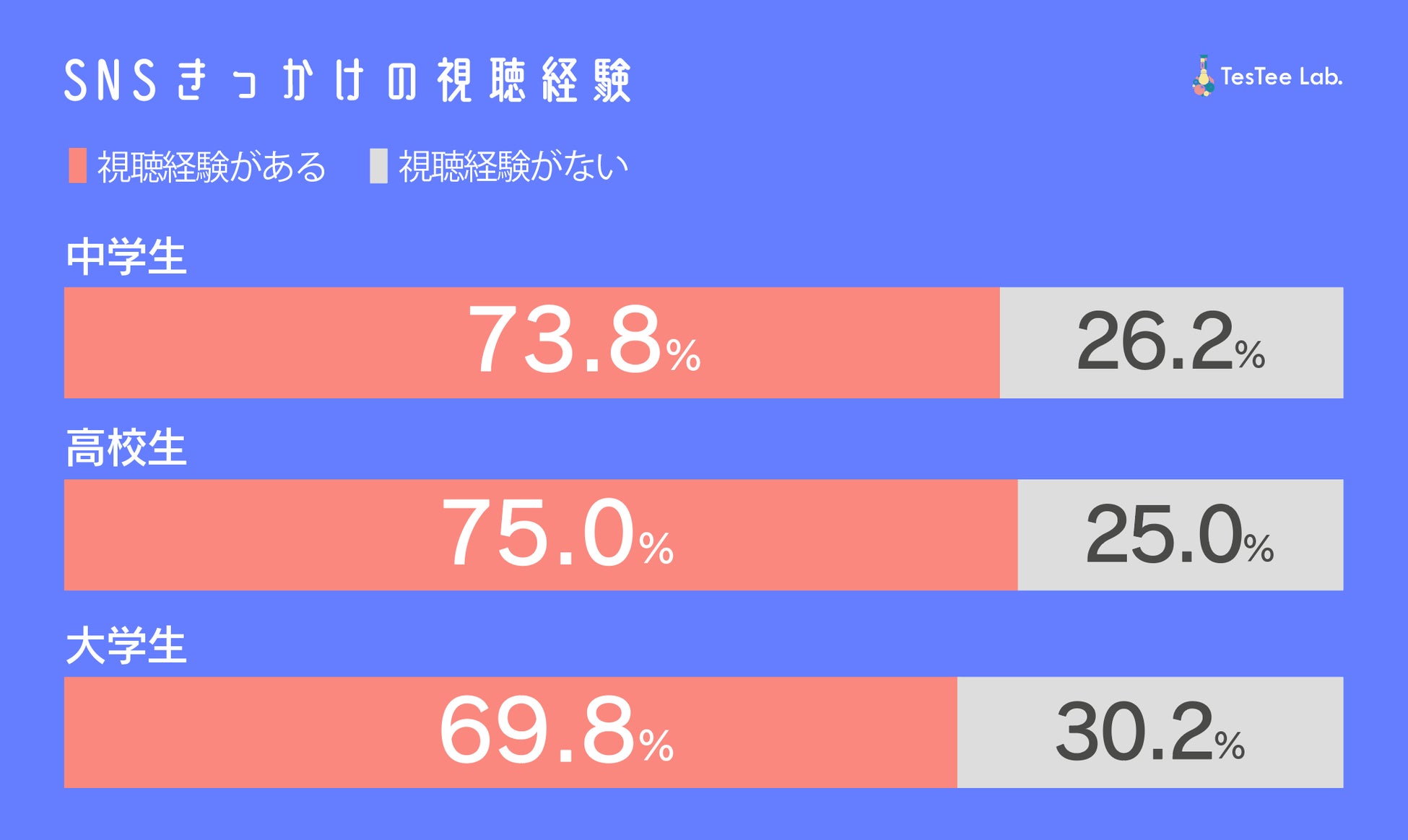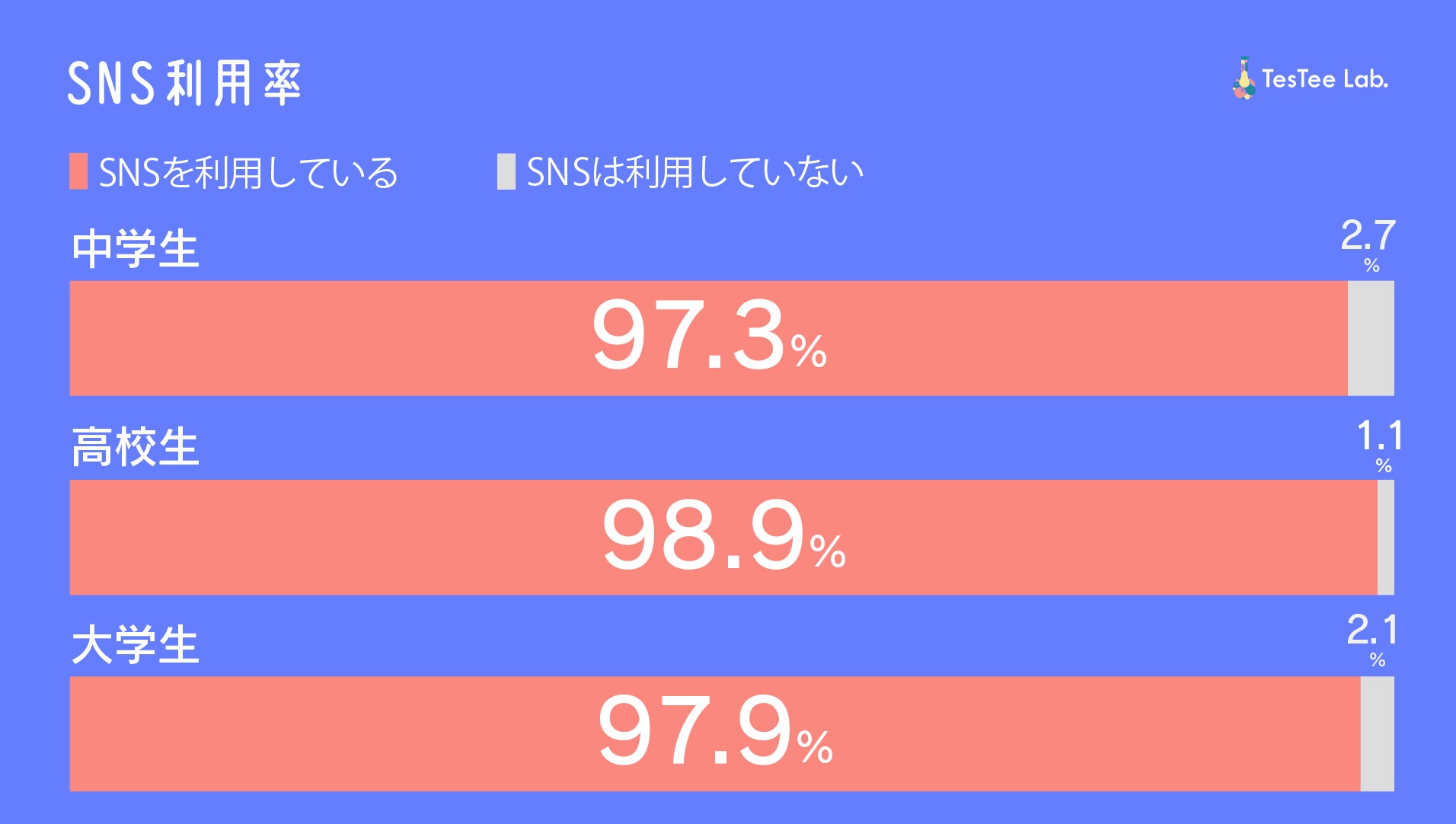 メディア事業・リサーチ事業・プロモーション事業・広告代理事業を展開する株式会社テスティー(本社:東京都渋谷区、代表取締役:横江優希)は、若年層リサーチ結果を発信する「TesTee Lab」にて、学生の男女4,226名(中学生474名、高校生1,493名、大学生322名)を対象にSNS利用に関する調査を実施しました。