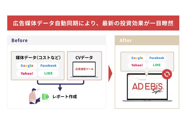 2022年4月より提供開始している「アドエビス シンク」のアップデート第3弾となる本機能の追加により、「アドエビス シンク」では、広告効果測定時に必要な計測パラメータの発行・入稿から広告媒体の計測データ取得、広告代理店手数料(マージン)を加味した広告コストデータの算出までの広告運用プロセスを自動化いたします。