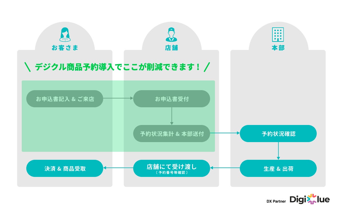 「デジクル商品予約」は、顧客がデジタル上で簡単に商品の予約を行えるサービスです。従来必須だったサービスカウンターでの予約が不要となり、店舗スタッフの予約受付・伝票の記入・本部への連絡業務が削減されました。