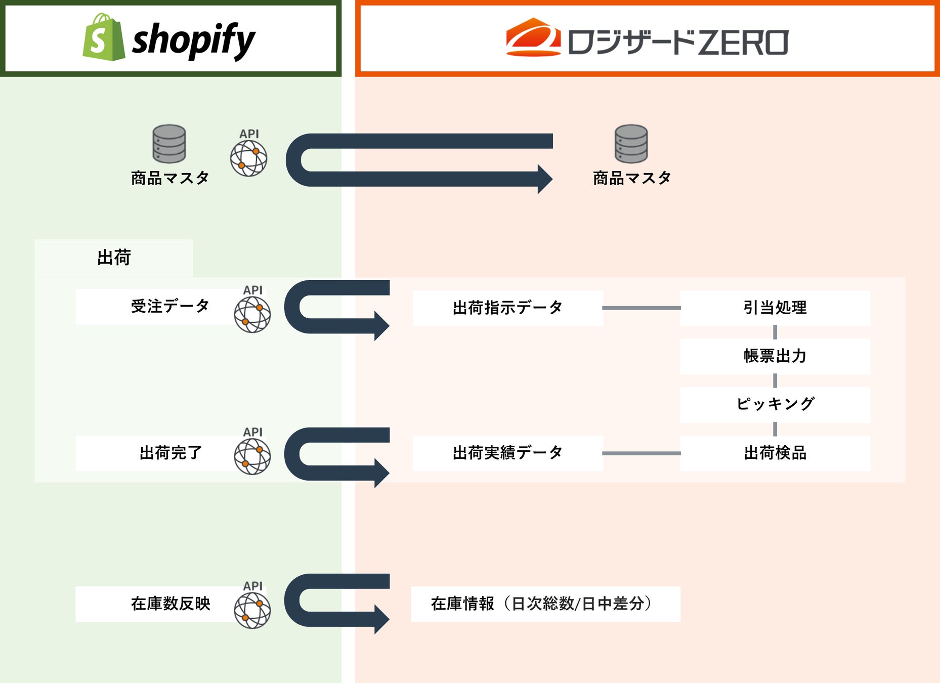 Shopifyから受注データの自動送信、出荷業務が完了すると送り状番号が入った実績データをロジザードZEROから自動送信します。また、Shopifyでの取引以外に発生する入出荷で変動した在庫情報をロジザードZEROからShopifyにリアルタイムに連携することで、過剰受注や売り越しを防止できます。