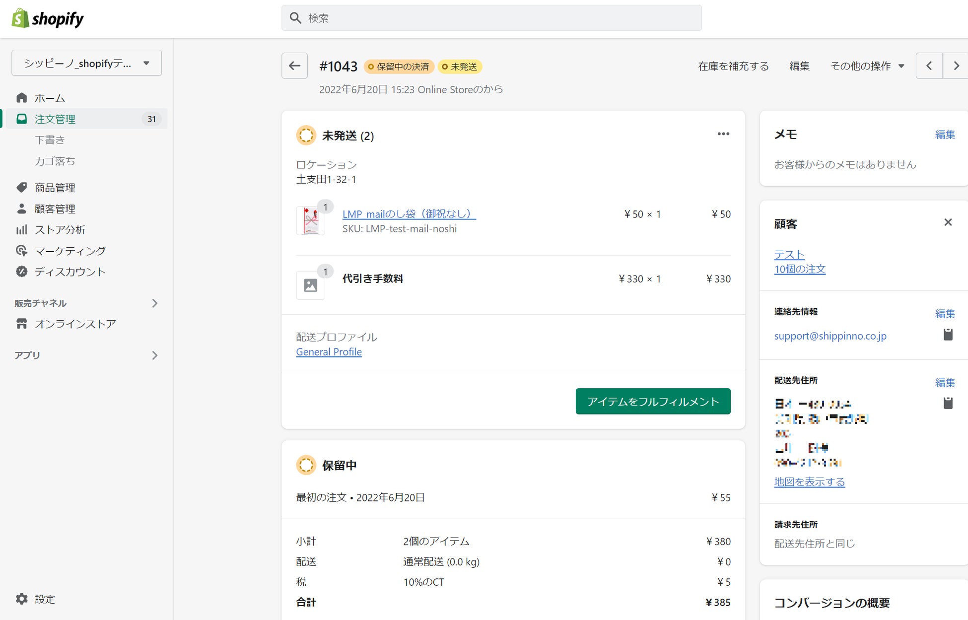 - 自動出荷アプリ「シッピーノ」を利用しており、Shopifyとの連携を設定していること
