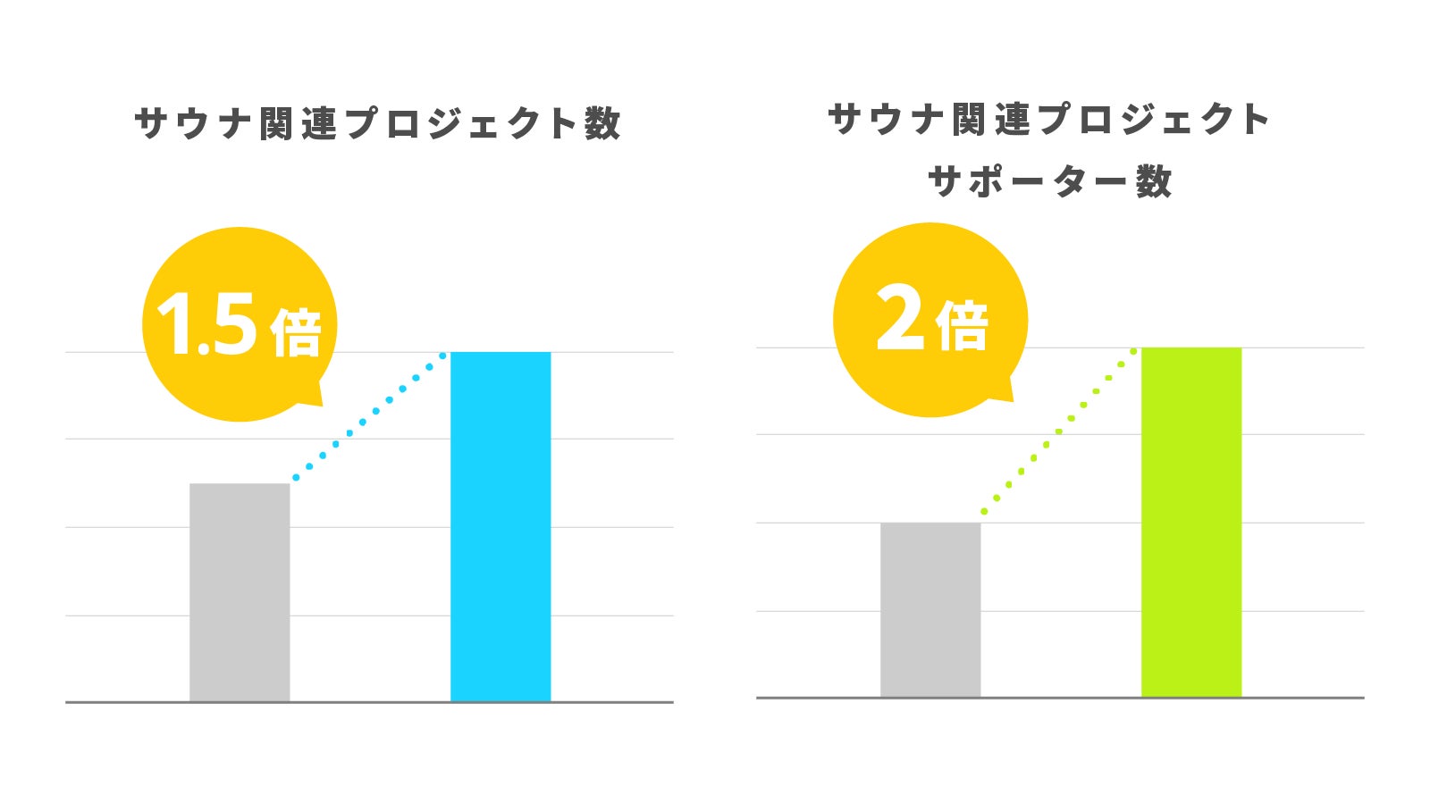 2022年11月3日(木)時点で終了しているプロジェクトのデータを対象にした2021年と2022年の比較では、サウナ関連プロジェクト数が1.5倍増、サポーター数が2倍増とサウナ関連プロジェクトの顕著な成長が見えています。また、サウナ関連プロジェクトの累計応援購入総額は2億円を突破しています。