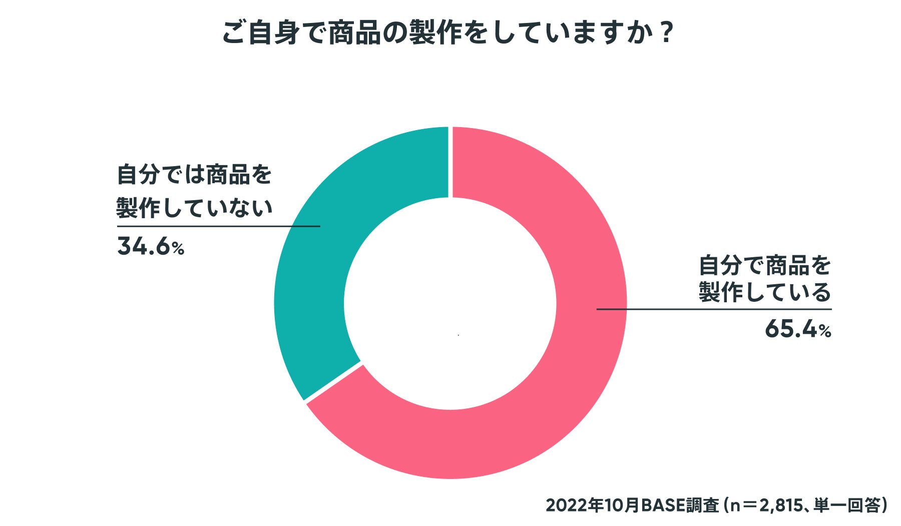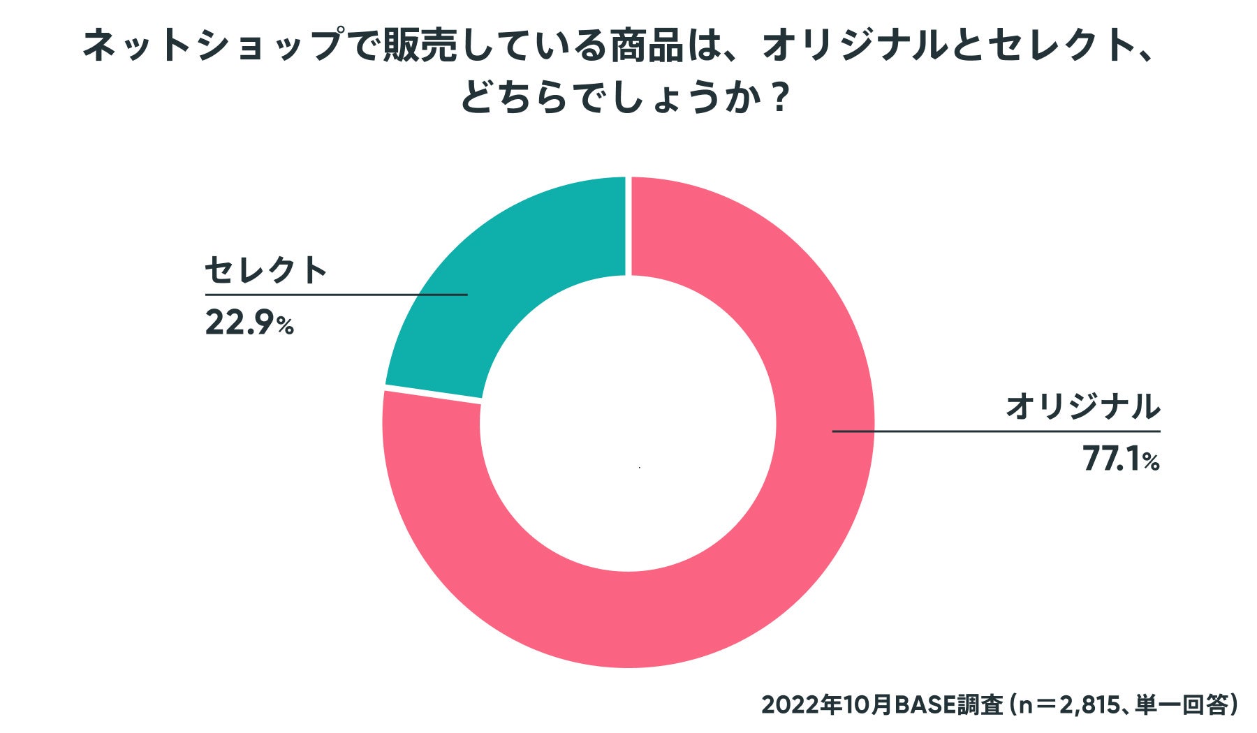 ネットショップで取り扱う商品に関する質問では「オリジナル」が77.1%、「セレクト」が22.9%と、昨年同様に約8割が「オリジナル」の商品を扱っていることがわかりました。また、「オリジナル」の商品を扱うショップオーナーのうち、「ご自身で商品の製作をしている」方は65.4%で、こちらも例年通り約6割がネットショップを運営しながらご自身で商品を製作している状況です。