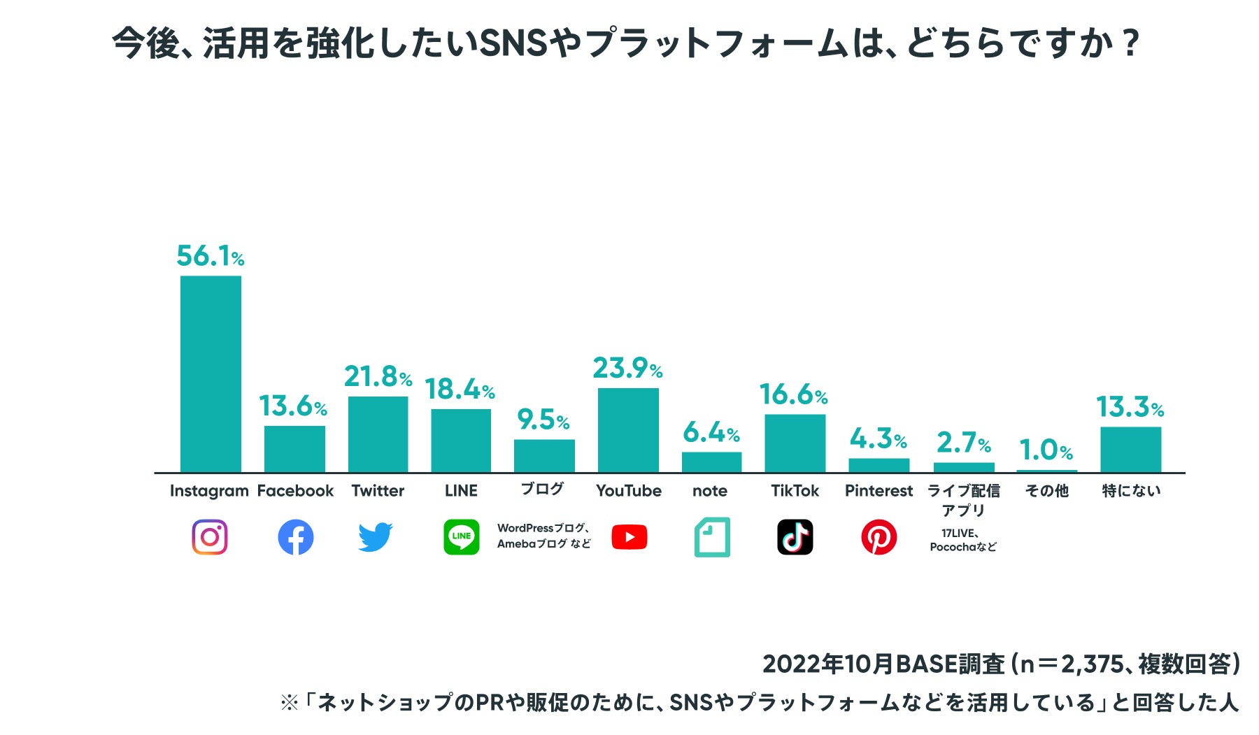 今後利用を強化したいSNSやプラットフォームでも1位は「Instagram」となり昨年と順位は変わりませんでしたが、2位は「YouTube」3位は「Twitter」となり、「Twitter」の利用意向が低下して「YouTube」と逆転しました。なお、今回5位だった「TikTok」は積極的に活用しているSNSと、今後利用を強化したいSNSやプラットフォームの差が+11.9%となり、昨年の差(+7.2%)よりも大幅に利用意向が伸長しました。なお、「BASE」は2022年5月に「TikTok」の利用者の増加を鑑み、「BASE」をご利用のネットショップで販売している商品データを基に「TikTok」に広告掲載できる拡張機能「TikTok商品連携・広告 App」を提供しています。
