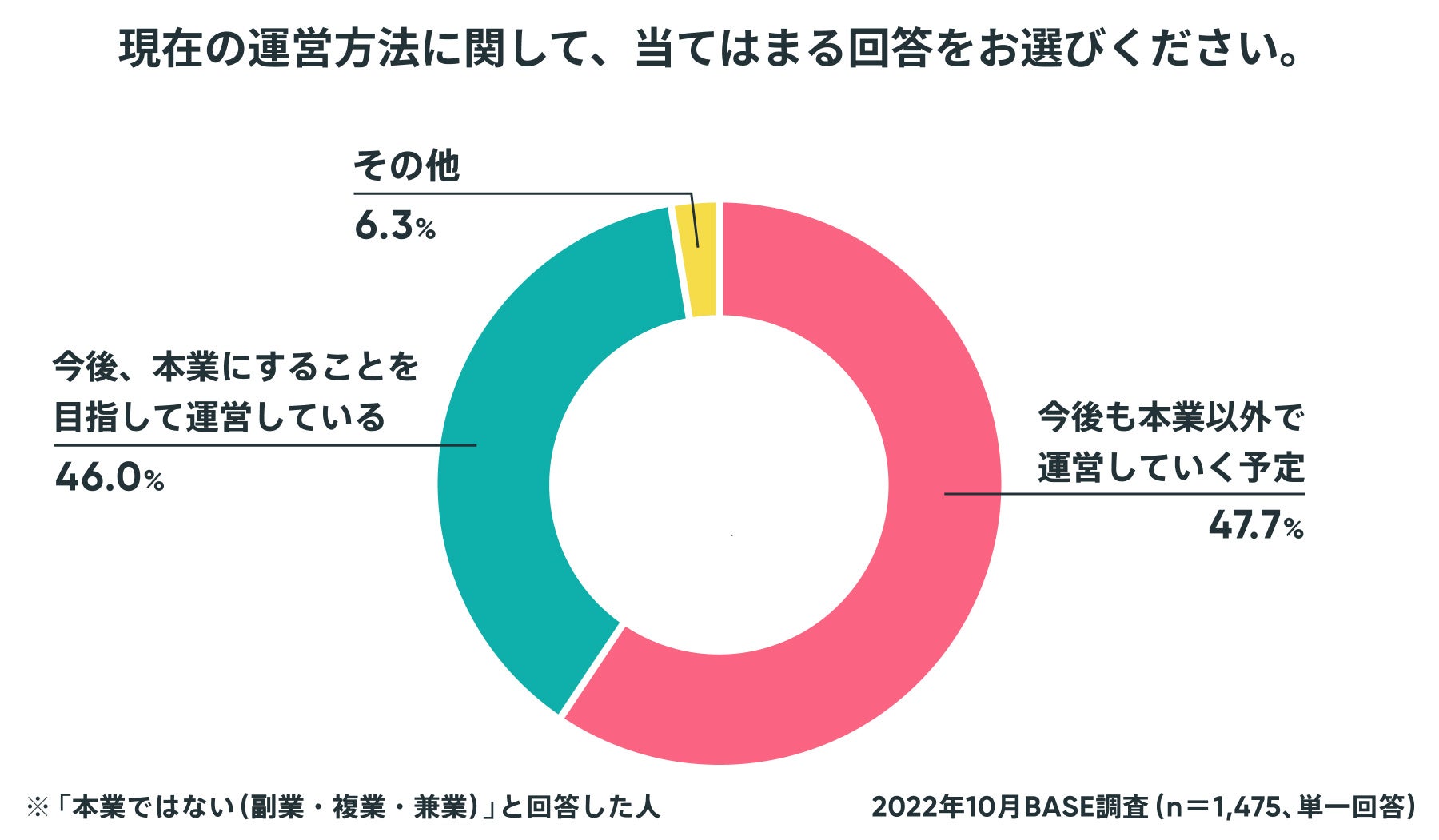働き方に関する調査では、ネットショップを「本業以外で利用」しているショップオーナーが51.8%、「本業で利用」しているショップオーナーが48.2%という結果となり、副業(兼業・複業)での利用が半数を超えました。さらに、「本業以外で利用」しているショップオーナーに向けて運営方針を尋ねたところ、「今後も本業以外で運営していく予定」と回答した方は47.7%、「今後、本業にすることを目指して運営している」と回答した方は46.0%となり、本業以外(副業・複業・兼業)での運営意向の方が高いということがわかりました。また、「その他」を選択されたショップオーナーからは「あくまでも趣味での運用・自分の好きなモノを作る延長で販売に挑戦している」といった回答もいただいており、「自分の好き」の延長上に拡販を位置づけている方もいました。