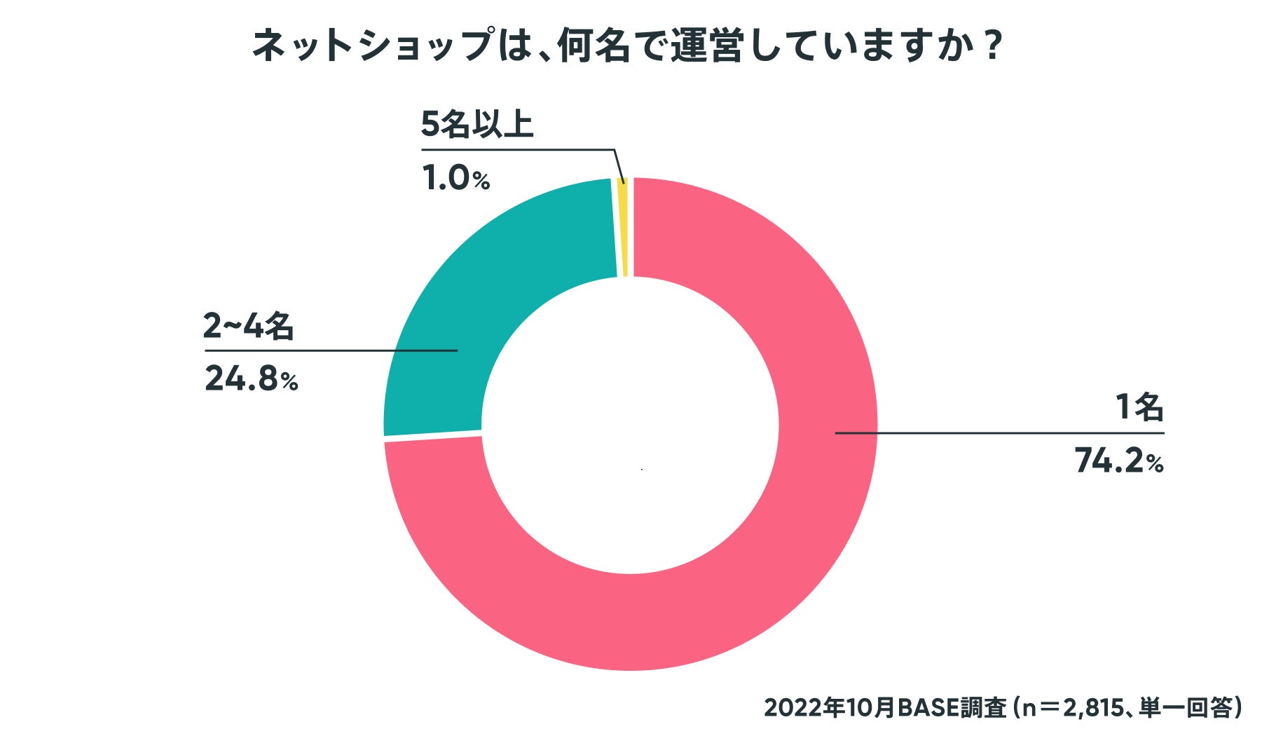 ネットショップの運営人数も、例年同様に「1名」がもっとも多く74.2%、「2〜4名」が24.8%と、4名以下が99%を占めており、個人・スモールチームの利用が微増しています。