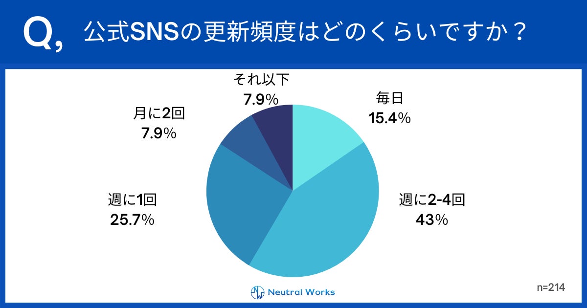 更新頻度は、「毎日」が15.4%、「週に2-4回」が43%と、約6割の企業が高い頻度で更新していることが分かりました。さらに週に1回以上更新する企業を含めると84.1%と高い割合を占めており、多くの企業が毎週SNSを更新していることが分かりました。
