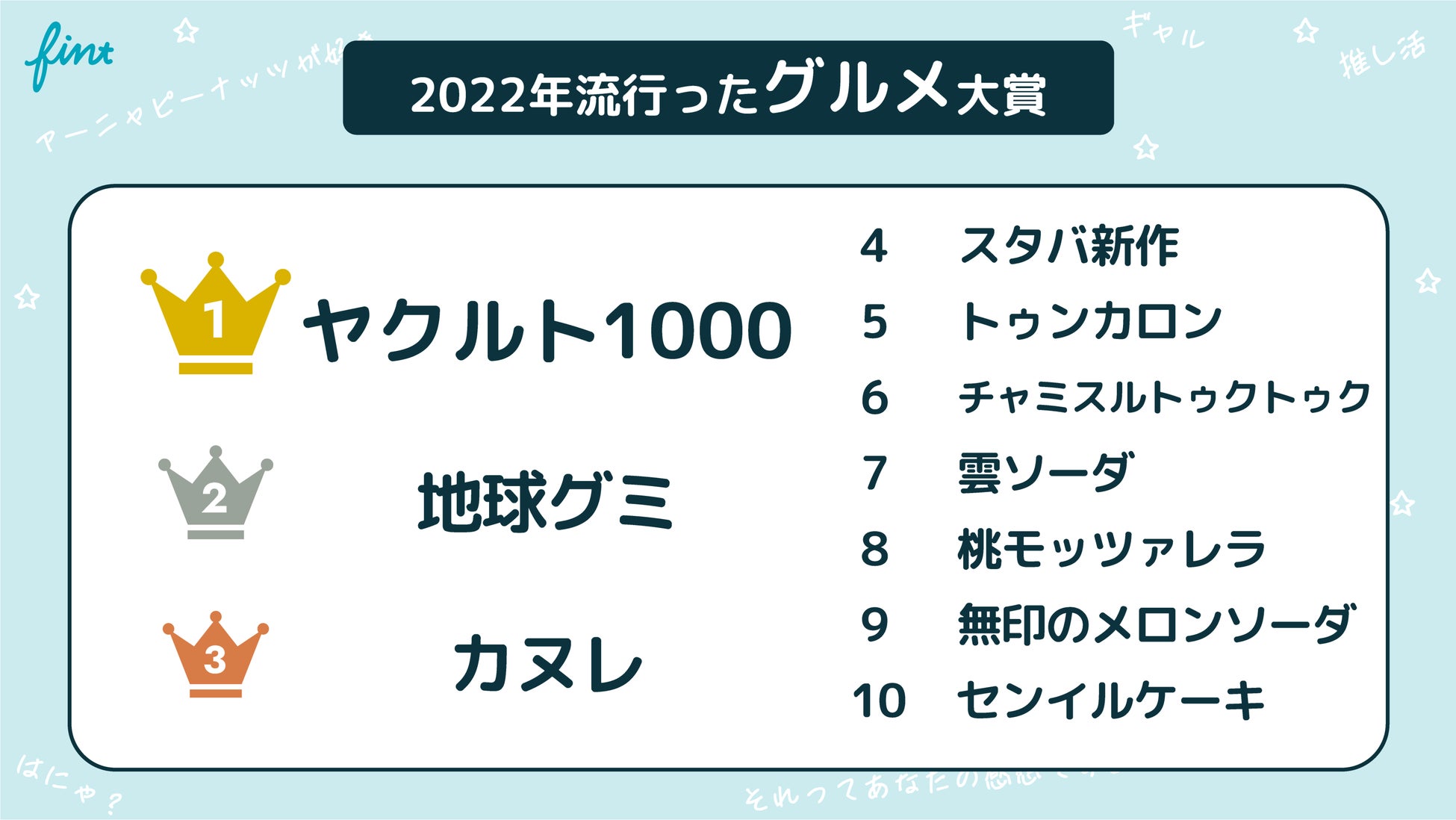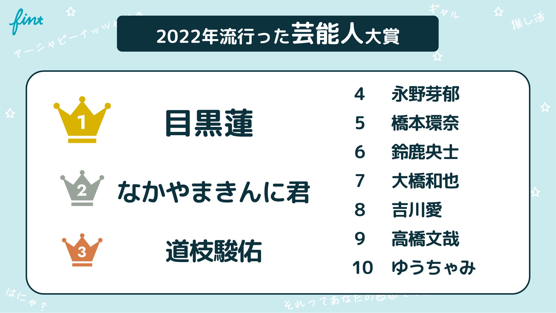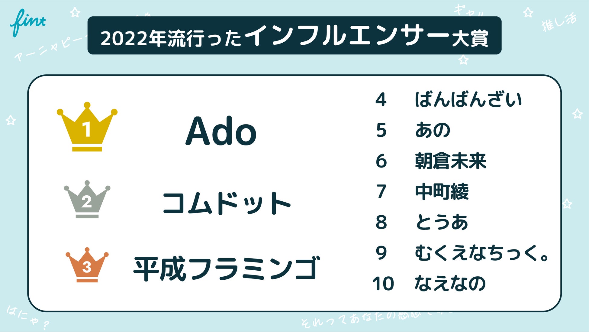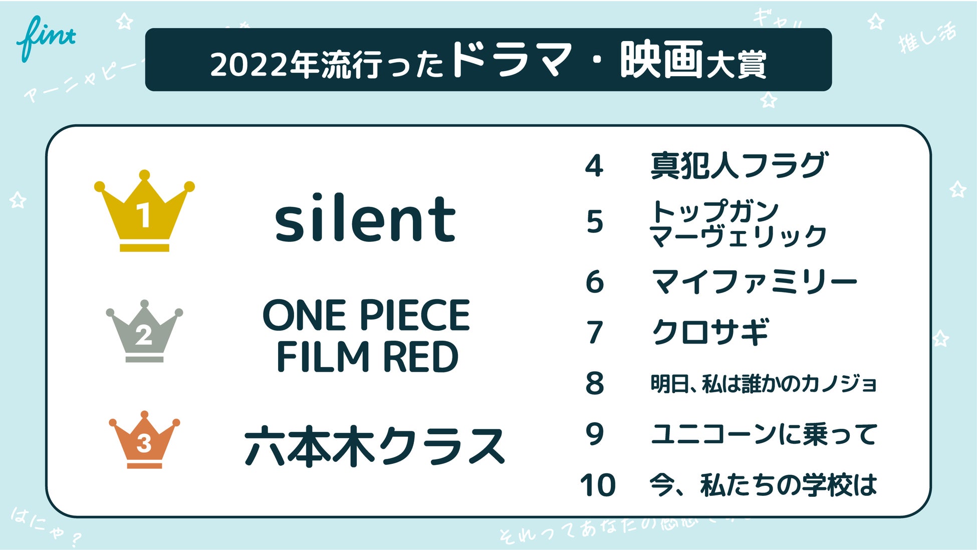 株式会社FinT(本社:東京都目黒区、代表取締役:大槻祐依)は、Z世代602名を対象に調査した結果をもとに、2022年のZ世代トレンドランキングを各部門ごとに発表します。