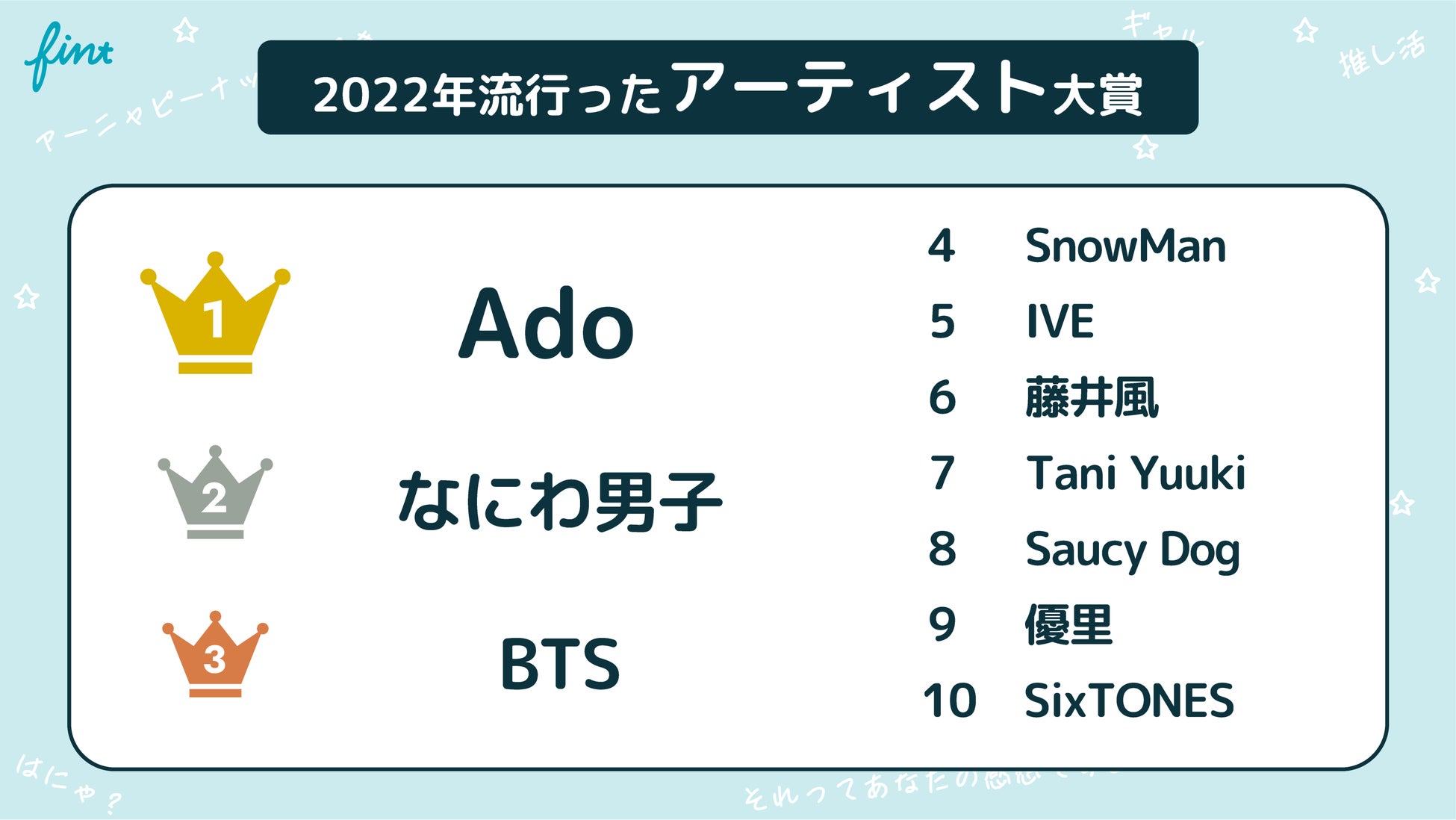 アーティスト部門でも1位となりましたが、SNS上での音源使用が多いことからインフルエンサーとしても堂々1位に。Z世代のカリスマ的存在を確立しています。